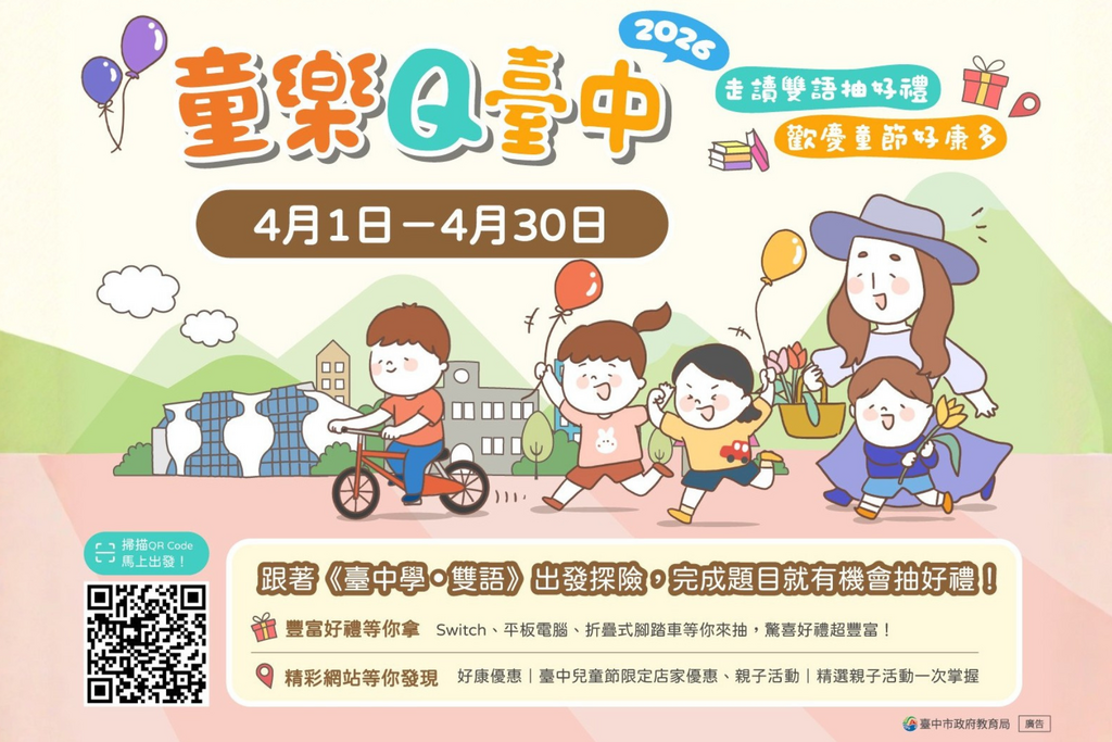 ②⓪②⑥ 兒童節限定 今年兒童節 一起解鎖臺中的城市冒險吧! 即日起至 2026年4月30日 https://kidsfun.tc.edu.tw 跟著《臺中學.雙語》走讀路線完成學習任務 還有機會參加抽獎 好禮、驚喜獎項通通等你來拿 Q,代表孩子最珍貴的寶藏 Question 提問 Quest 探索 Curiosity 好奇心 一起用腳步認識城市 用笑聲留下最棒的節日回憶! ...