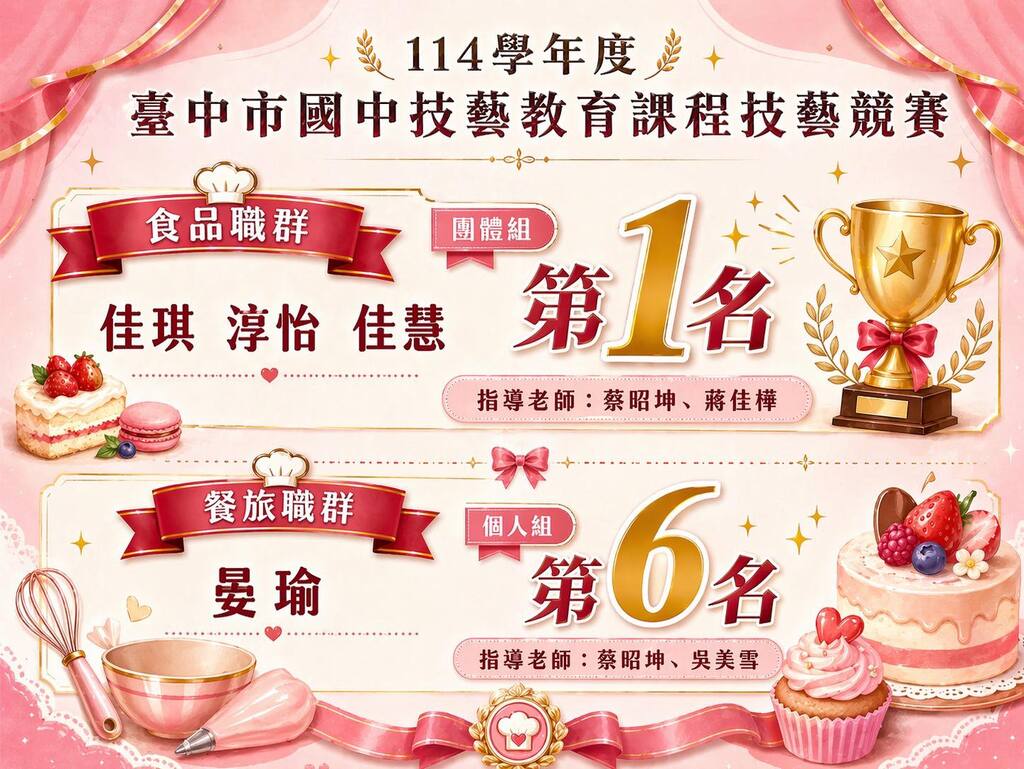 恭喜本校同學在 #114學年度臺中市國中技藝教育課程技藝競賽 中表現亮眼✨ 🍰 食品職群|團體組第一名 301 廖佳琪、302 胡淳怡、廖佳慧 🍽️ 餐旅職群|個人組第6名 301 陳晏瑜 你們的表現真的很棒👏 在一次次練習與實作中,把學到的技能轉化為成果, 也為自己累積了寶貴的經驗與自信💪 特別感謝指導老師們的用心付出: 👩🏫 食品職群|蔡昭坤老師、蔣佳樺老師 👩🏫 餐旅職群|蔡昭坤老師、吳美雪老師 一路陪伴、細心指導,讓孩子們穩穩發揮實力✨ 溪南重視多元教育的發展, 讓學習不只停留在書本裡, 也能透過雙手實作,做出屬於自己的成就🌱 #溪南國中 #技藝教育 ...