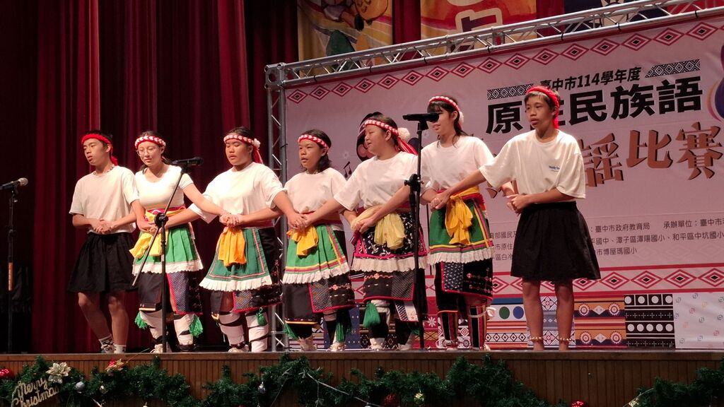 2025-12-22 教育局 報導點閱數:131 次教育動態為推動原住民族語言傳承與文化扎根,臺中市政府教育局每年舉辦族語傳統歌謠比賽,今年的競賽(20)日在潭子區潭陽國小舉辦,共計201名師生踴躍報名參賽,展現臺中市持續深耕族語教育的豐碩成果。 教育局指出,本次比賽組別多元,包含獨唱低年級組、獨唱高年級組、獨唱國中組、獨唱社會組,以及重唱混合組與國中、國小團體組,參賽者身著族服演唱傳統歌謠,透過歌聲傳遞族群文化記憶,現場氣氛熱烈,充分展現原住民族文化的深厚底蘊。 多位參賽學生分享,穿著族服以族語演唱傳統歌謠感到十分開心,也更認識自己的文化;透過準備比賽的過程,不僅提升族語聽說能力,也加深對傳統歌謠文化內涵的理解,收穫良多。 教育局表示,市府長期重視原住民族語傳承與文化教育,除了辦理族語傳統歌謠、朗讀等等競賽外,也透過公開觀議課研習及族語老師共備社群,深化族語老師原住民族教育內涵,並積極營造校園族語學習環境,持續辦理「全民原教列車」活動、原住民傑出人士生命教育講座,將原住民族文化與勵志故事帶進各校。 此外,教育局規劃於114學年度辦理「原來的樣子-孩子眼中的原住民族」主題展覽活動,透過學生創作與多元形式呈現,引導師生以不同視角認識原住民族文化,進一步落實全民原教精神,共融共好的教育環境。