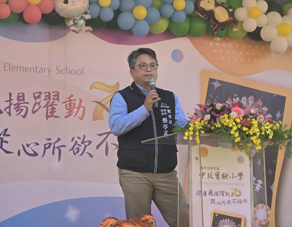 臺中市和平區中坑國小70週年校慶(29)日熱鬧登場,教育局蔡亭孟專門委員到場祝賀,與中坑國小社區賢達、全校親師生共襄盛舉這場慶典,並邀請歷屆校友、歷屆家長會長、校長以及民意代表等見證中坑國小的成長與轉型為實驗學校的創新活力,現場氣氛熱鬧非凡。