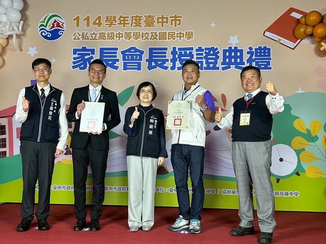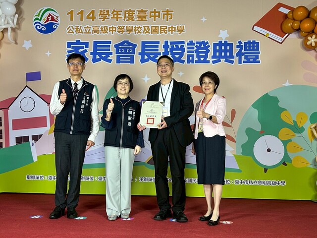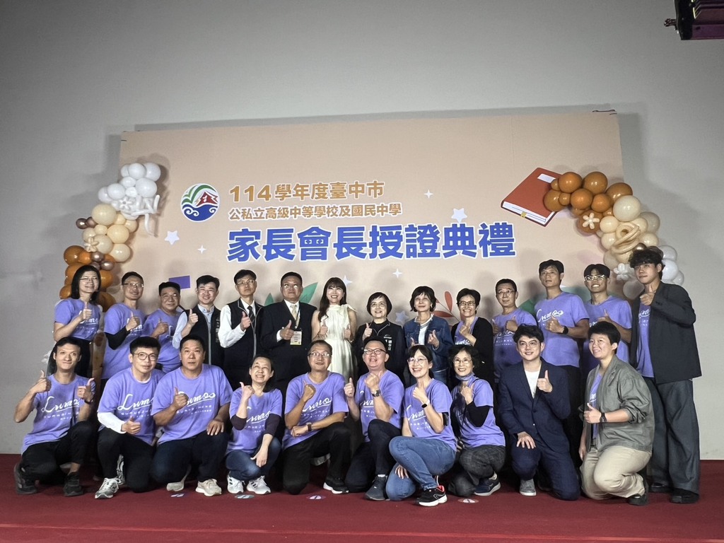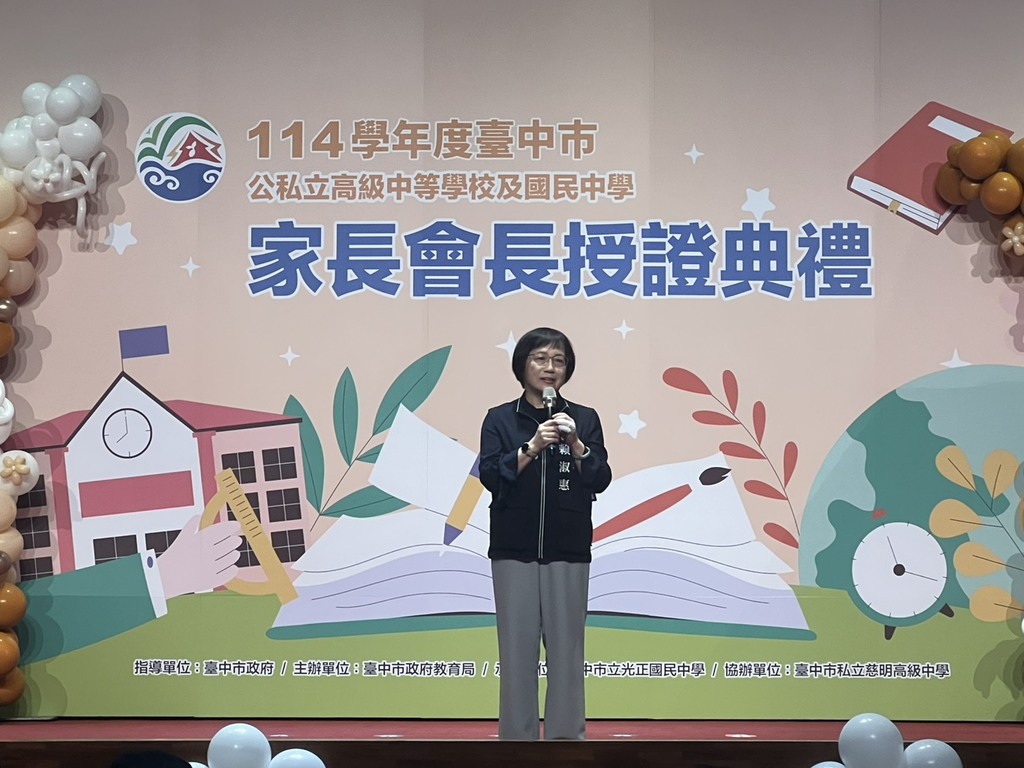 臺中市政府教育局今(1)日在慈明高中舉辦「114學年度臺中市公私立高級中學及國民中學家長會長授證典禮」,市長盧秀燕頒贈聘書與感謝狀予本市123所高、國中新(連)任及卸任家長會長,並感謝所有家長會長以愛心與行動支援教育,成為學校與家庭間最重要的橋樑,也期勉大家持續攜手合作,共創優質的教育環境。