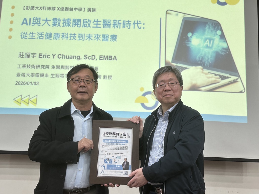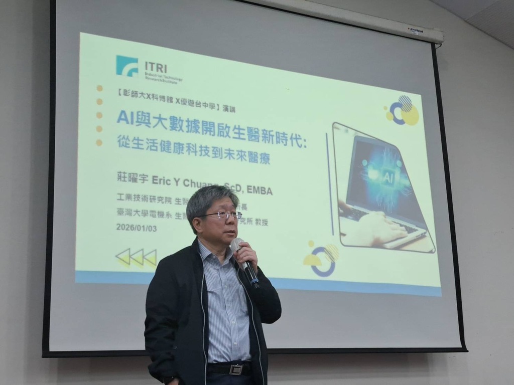 為積極推動科普教育,國立彰化師範大學、國立自然科學博物館攜手臺中市教育局優遊臺中學,共同策劃辦理「傑出科普講座」,第三場次1月3日在新社高中登場,邀請工業技術研究院生醫與醫材研究所所長莊曜宇博士,以「AI大數據開啟生醫新時代:從生活健康科技到未來醫療」為題,深入剖析人工智慧如何翻轉醫療現況,引領師生探索生物科技與資訊及通訊科技(BIO+ICT)跨域融合的創新趨勢。