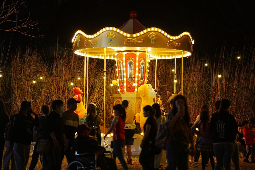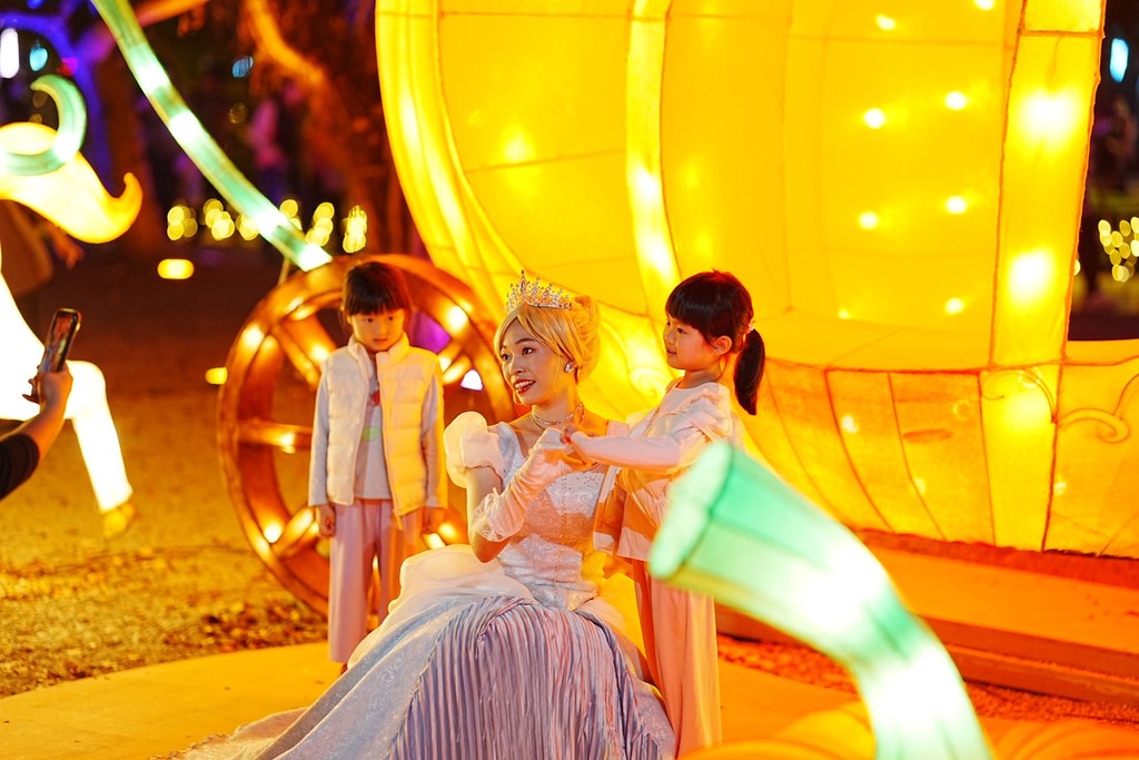 教育局表示,走進「童趣歡樂谷」,彷彿踏入一座會發光的童話世界:金黃燈光宛如星河鋪展,搭配林間光影與繽紛燈飾,讓親子在散步賞燈時,也能享受一段專屬於家人的夜間小旅行;許多家長推著娃娃車、牽著孩子慢慢走,沿途拍照打卡、留下合影,成為本屆燈會最暖心的風景。其中,「幸福馬車」人氣居高不下,仙杜瑞拉驚喜現身與孩子近距離互動,不少小朋友在南瓜馬車前排隊合影,有的主動揮手打招呼、有的開心擁抱,讓童話場景不再只是故事,而是孩子能真實參與的美好記憶;有許多祖孫三代同框拍照,留下「一起長大」的珍貴畫面。
