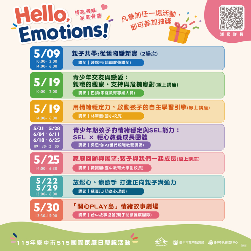 此外,整個5月「2026幸福台中家庭月」期間,還整合了文化局轄下圖書館的親子共讀、警察局的安全宣導與運動局的路跑活動,將整個台中變成一座歡樂家庭遊樂場。另有多項精彩的系列活動,包含攜手LaLaport推出快閃「開心Play島」情緒故事劇場;邀請到講師吳思怡開授「青少年期孩子的情緒穩定與SEL能力」穩心教養成長團體課程;另推出「親子共學從舊物變新寶:按摩垂垂棒」活動,以及由台中教育大學副校長黃寶園講授「家庭回顧與展望:孩子與我們一起成長」親職教育線上講座等。