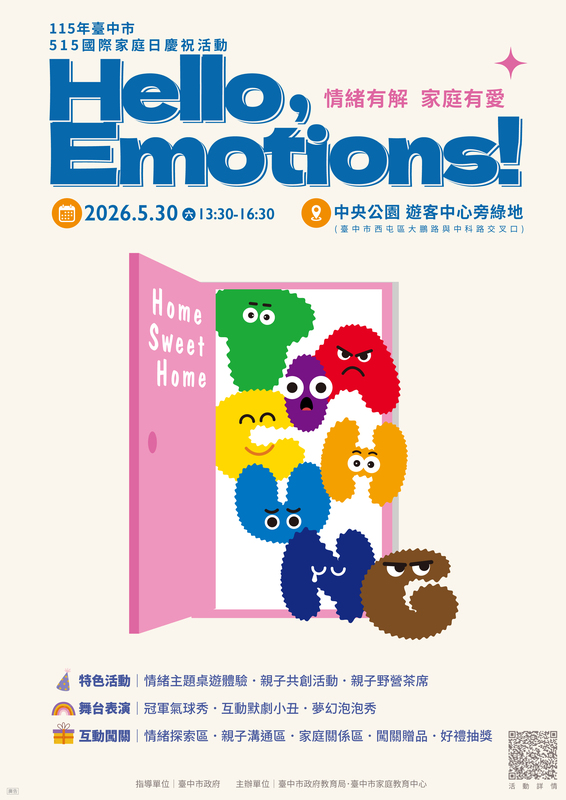 家庭教育中心指出,當天活動除了豐富的舞台表演與摸彩抽獎外,另有多樣化的互動闖關專區。活動識別系統將以台中英文「TAICHUNG」為造型,轉化為信任、期待、不安、生氣等8大基本情緒角色,讓親子在遊戲中自然學習情緒管理與溝通默契。