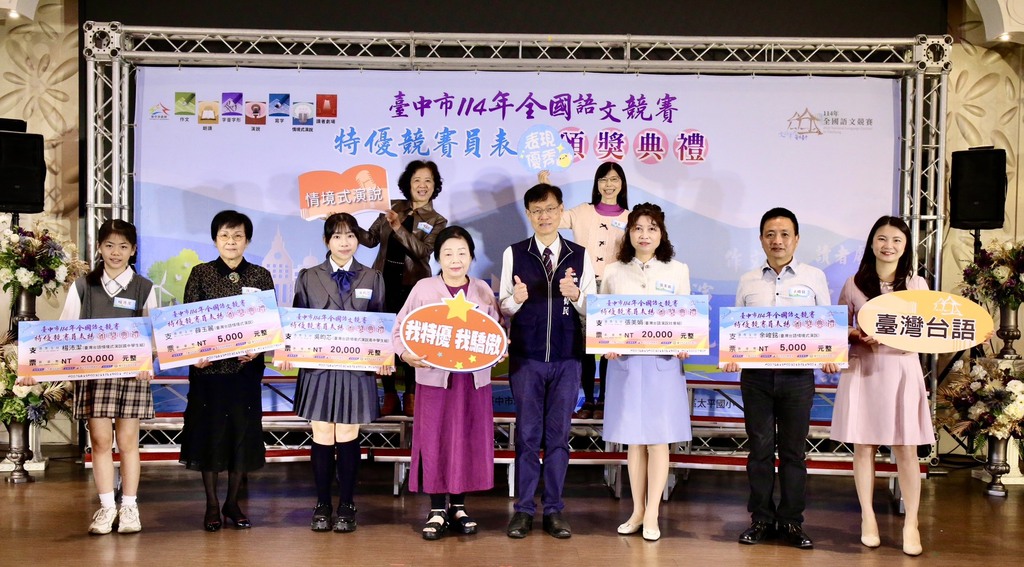 2025-12-15 教育局 報導點閱數:371 次教育動態114年全國語文競賽日前在臺中市圓滿落幕,臺中市派出168名競賽員參加個人賽,共榮獲82座特優,獲獎率全國居冠;另派10所學校參加團體賽「讀者劇場」,全數獲獎,成績耀眼。臺中市政府教育局今(12/15)日舉辦頒獎典禮,教育局長蔣偉民代表市長盧秀燕,對獲得特優的競賽員及其指導老師、集訓保母及在臺中市分區賽中獲得團體獎第一名的學校進行表揚。 蔣局長表示,市長盧秀燕高度重視語文教育的扎根,市府多年來投入經費辦理語文競賽、閱讀教育及多元語言學習,109年起本市在全國語文競賽中6度蟬聯獲獎率全國第一的佳績,另今年教育部公布的「114年全國閱讀績優學校、團體及個人獎」中,臺中市共奪下15項殊榮,已連續4年全國居冠,成果相當豐碩。 蔣局長表示,「全國語文競賽」不僅展現語文能力,更是文化傳承與書香凝聚的重要契機。全國語文競賽已邁入第80屆,今年共有22縣市、總計2,585位選手(個人賽2,062位;團體賽143隊、523位)角逐語文界最高榮譽。競賽項目涵蓋朗讀、演說、情境式演說、字音字形、寫字、作文及讀者劇場等七大類,語別包含國語、台灣台語、台灣客語及台灣原住民族語言;競賽組別分為國小學生組、國中學生組、高中學生組、教師組及社會組等五大組。 蔣局長今天為獲得特優的競賽員及其指導老師頒發獎勵金,並致贈感謝狀予語文培訓有功人員,嘉勉競賽員們的優異表現,並感謝學校校長對語文教育的支持,也謝謝指導老師、集訓保母老師在準備競賽過程中的辛勤付出,幫助學生建立信心,並鼓勵選手們持續努力,未來再創佳績。 今日獲表揚的臺中市分區賽團體獎第一名學校包括:國小組的清水區清水國小、梧棲區大德國小、太平區新光國小、東勢區中山國小、私立育仁國小、西區大勇國小、南屯區永春國小、北屯區軍功國小;國、高中組則有市立大雅國中、豐東國中、光榮國中、居仁國中、明道高級中學及臺中一中。