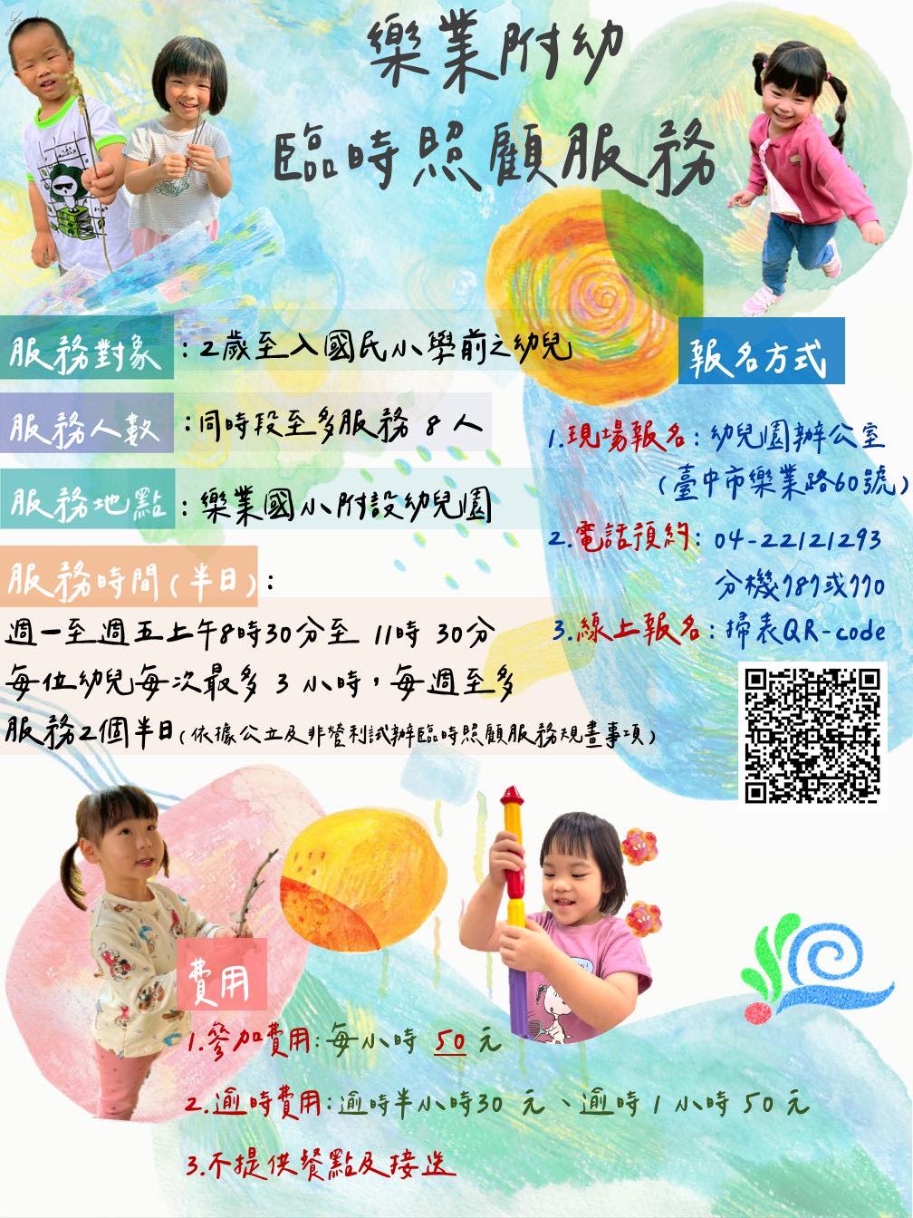 臺中市東區樂業國民小學附設幼兒園114學年度臨時照顧服務資訊