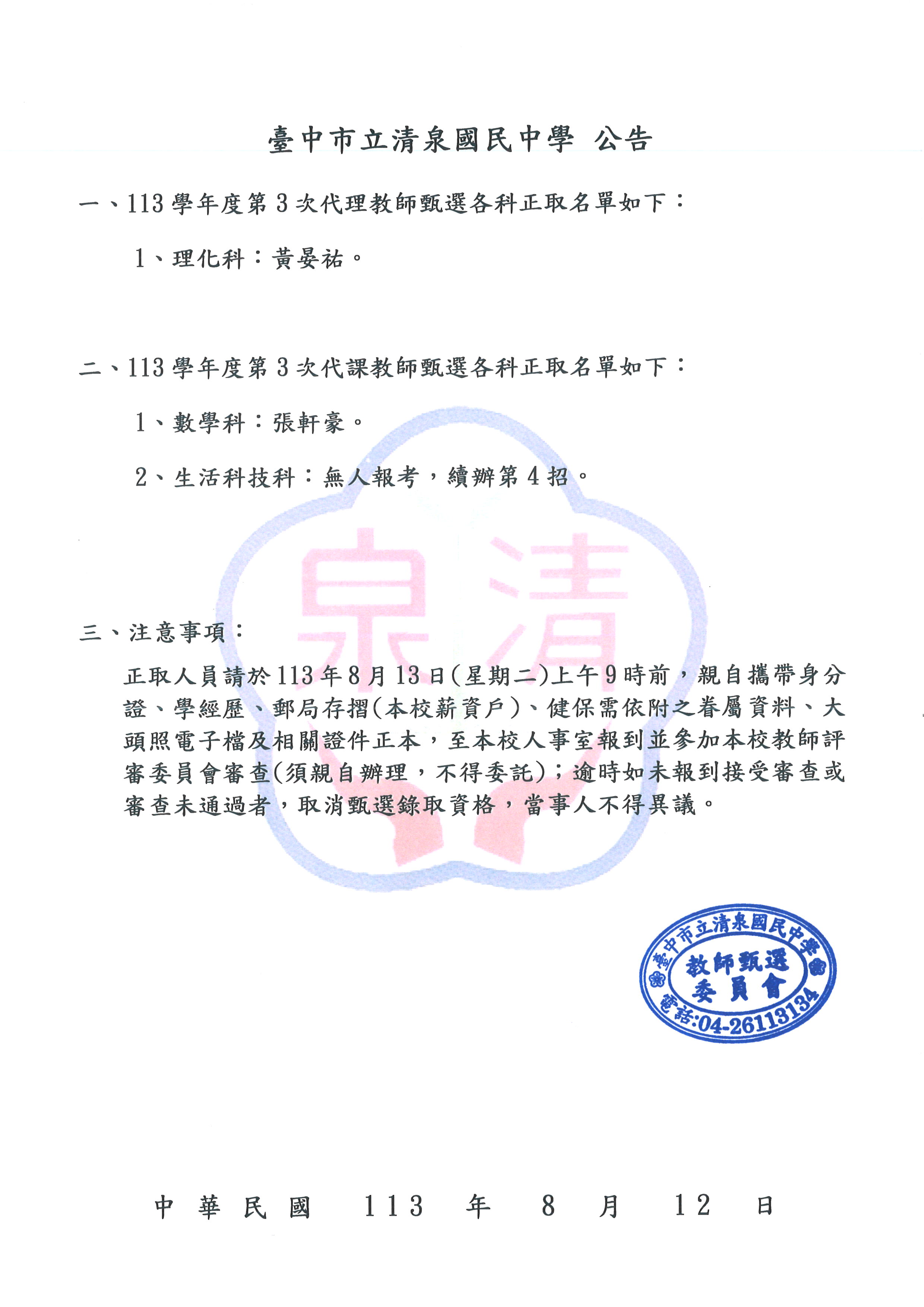 113學年度臺中市立清泉國民中學第3次代理代課教師甄選結果及第4次甄選公告_1130812