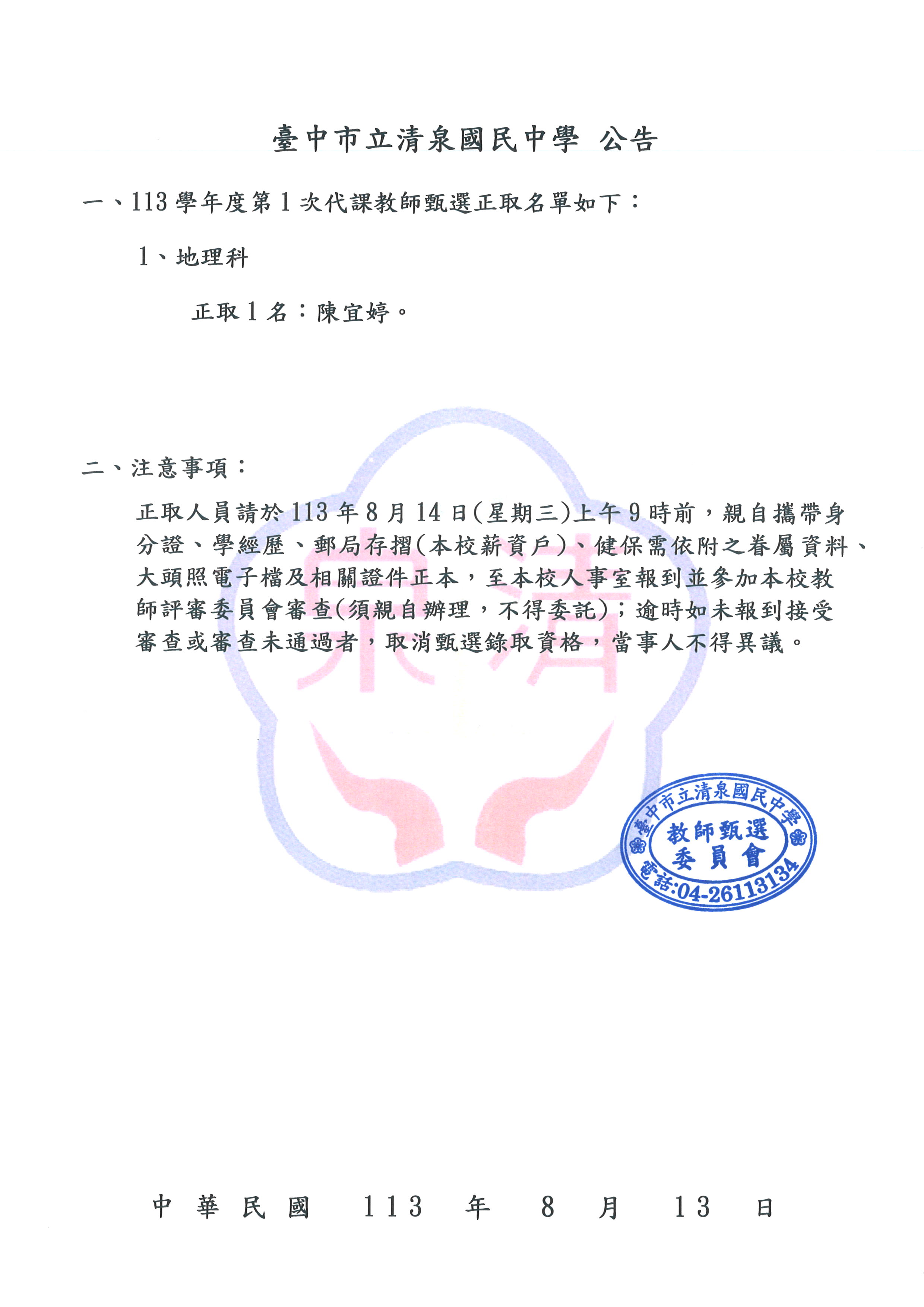 113學年度臺中市立清泉國民中學第1次代課教師甄選結果_1130813