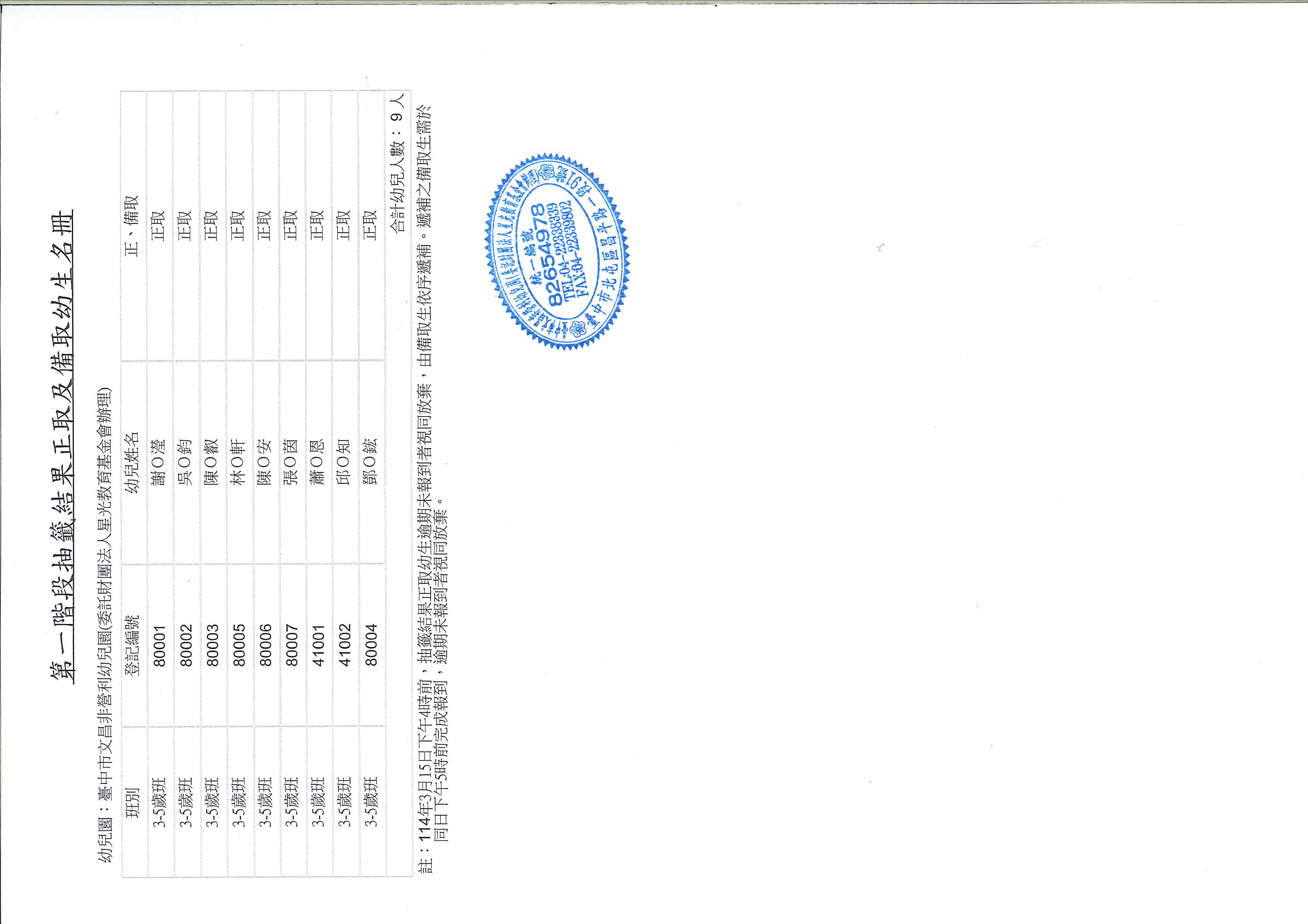 臺中市文昌非營利幼兒園114學年度第1階段招生 正取名單及完成報到錄取名冊