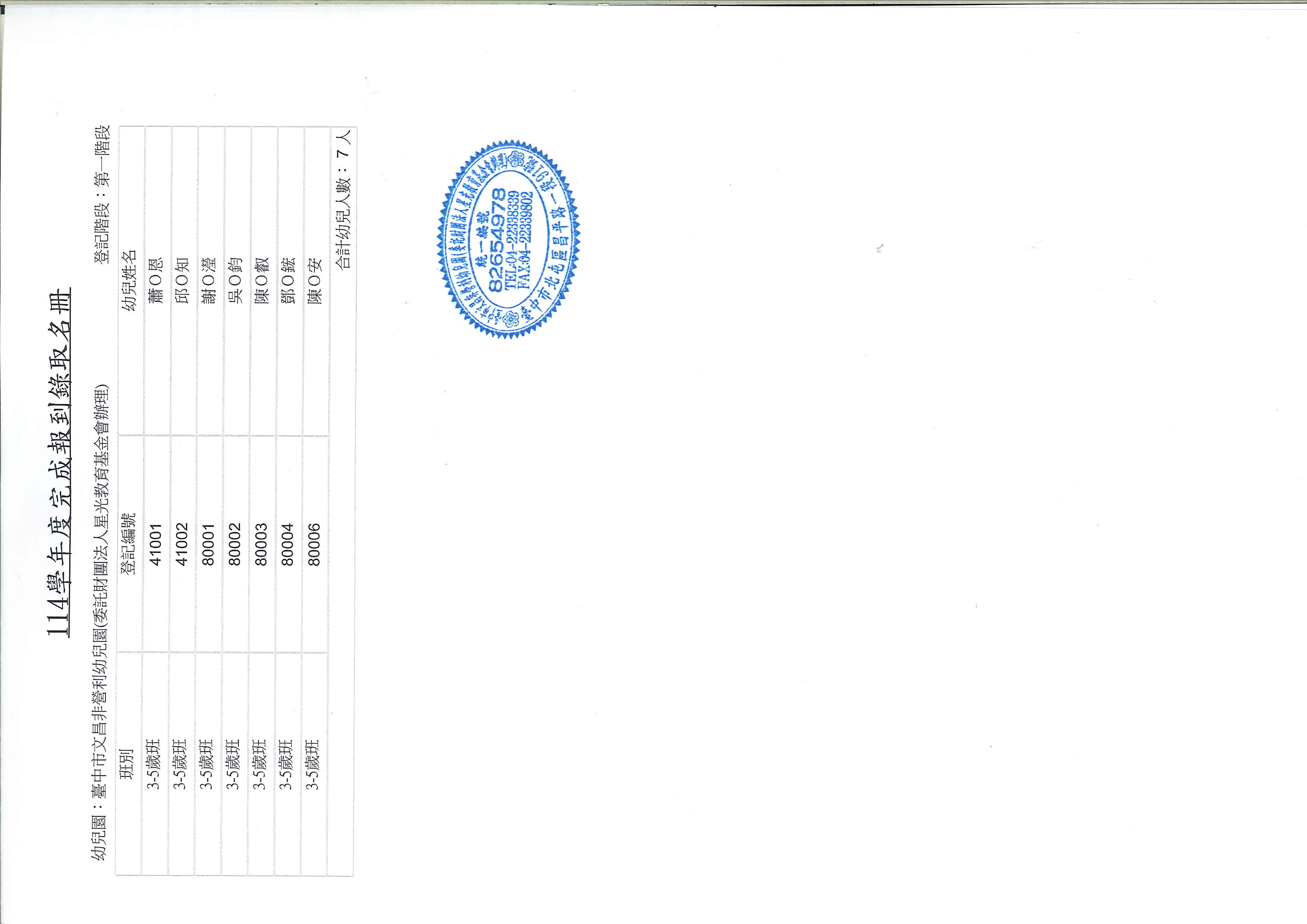 臺中市文昌非營利幼兒園114學年度第一階段 正取名單及完成報到錄取名冊