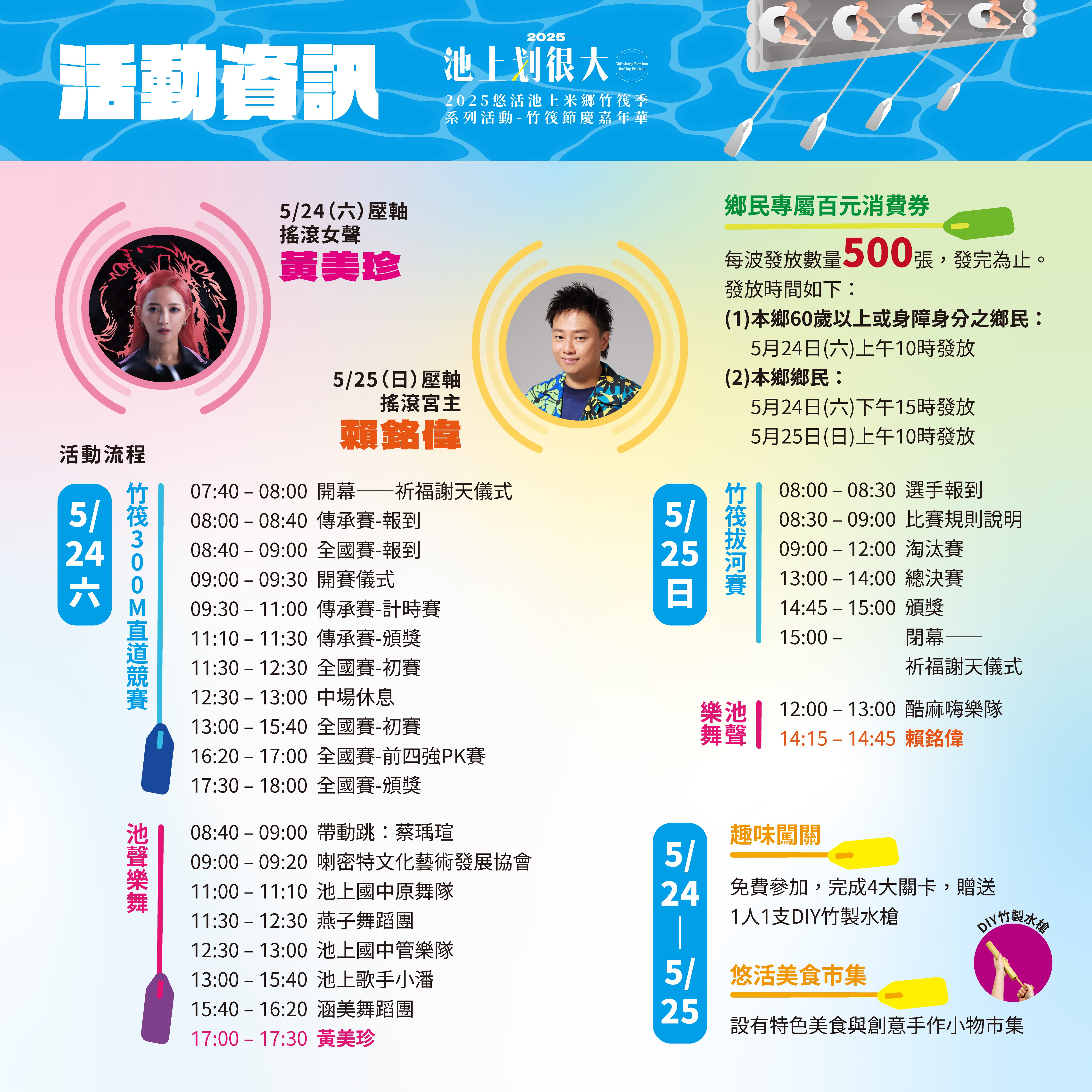 一、依據本府114年4月30日府授農秘字第1140118503號函辦理。 二、活動日期:114年5月24日至5月25日(星期六至星期日)。 三、電子宣傳DM請參閱附件。 四、本活動詳細資訊請至臺東縣池上鄉公所官方網站(https://www.cs.gov.tw/home/)或臺東縣池上鄉公所FB粉絲專頁查詢並以網站公告最新資訊為主。