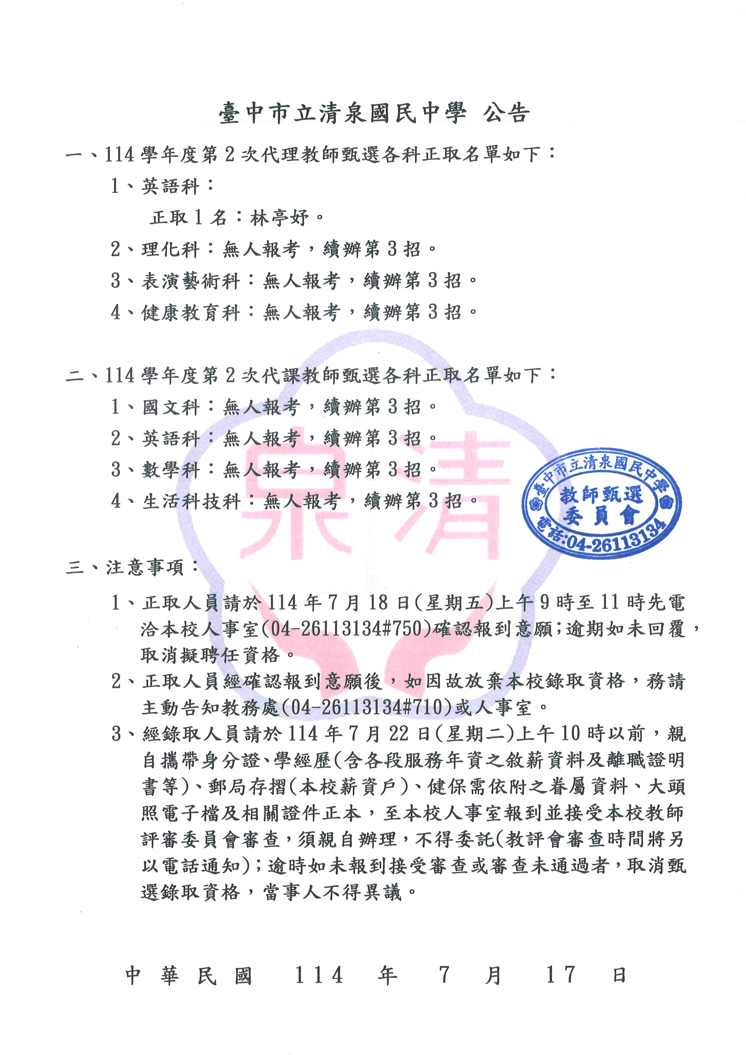 114學年度臺中市立清泉國民中學第2次代理代課教師甄選結果及第3次甄選公告_1140717