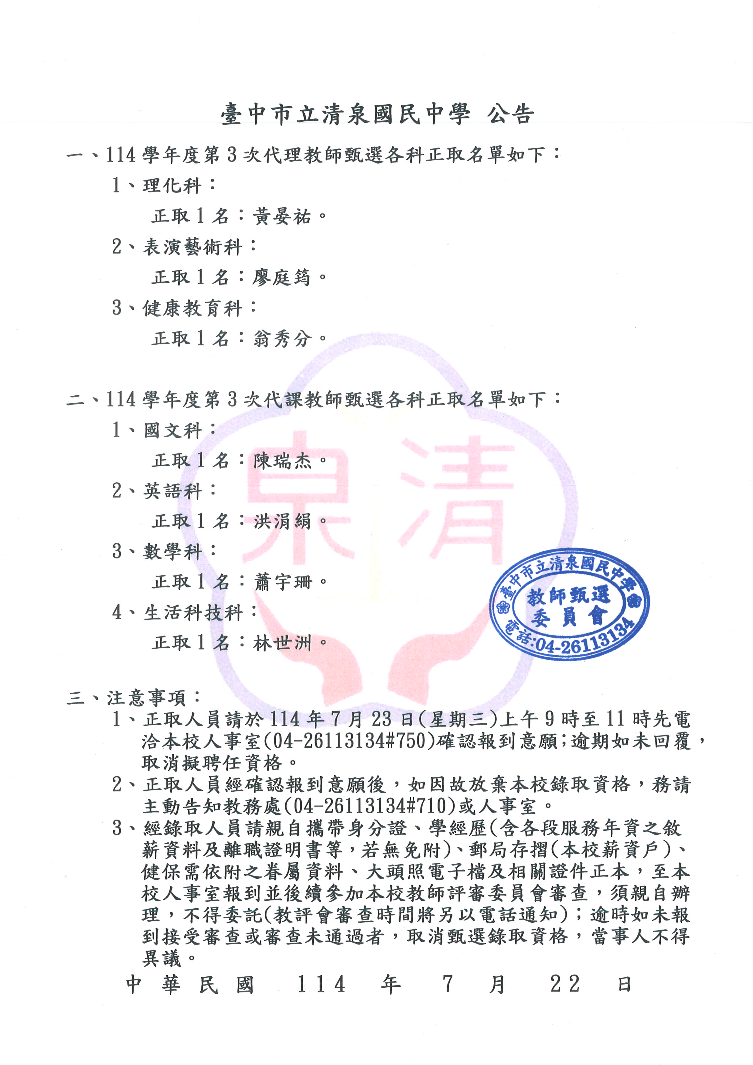 114學年度臺中市立清泉國民中學第3次代理代課教師甄選結果_1140722