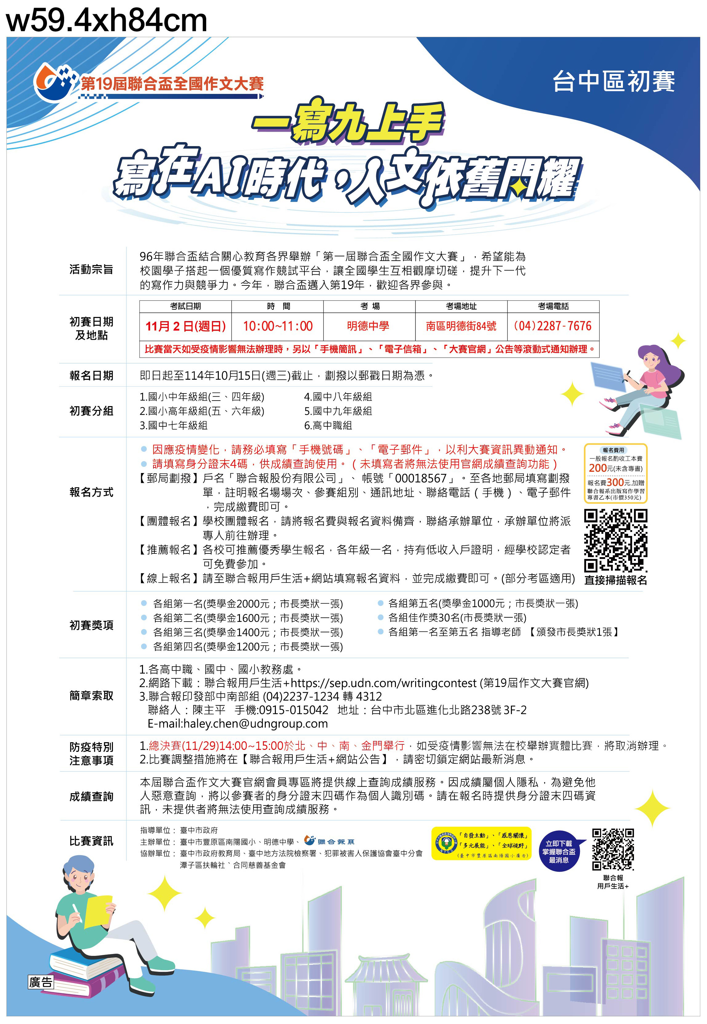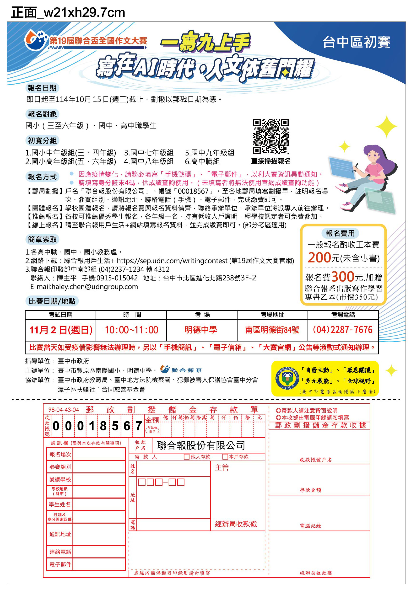 轉知聯合報發行展業部中部業務組辦理『第十九屆聯合盃全國作文大賽台中區初賽』資訊,本案屬收費性質,請本權責辦理,請查照。