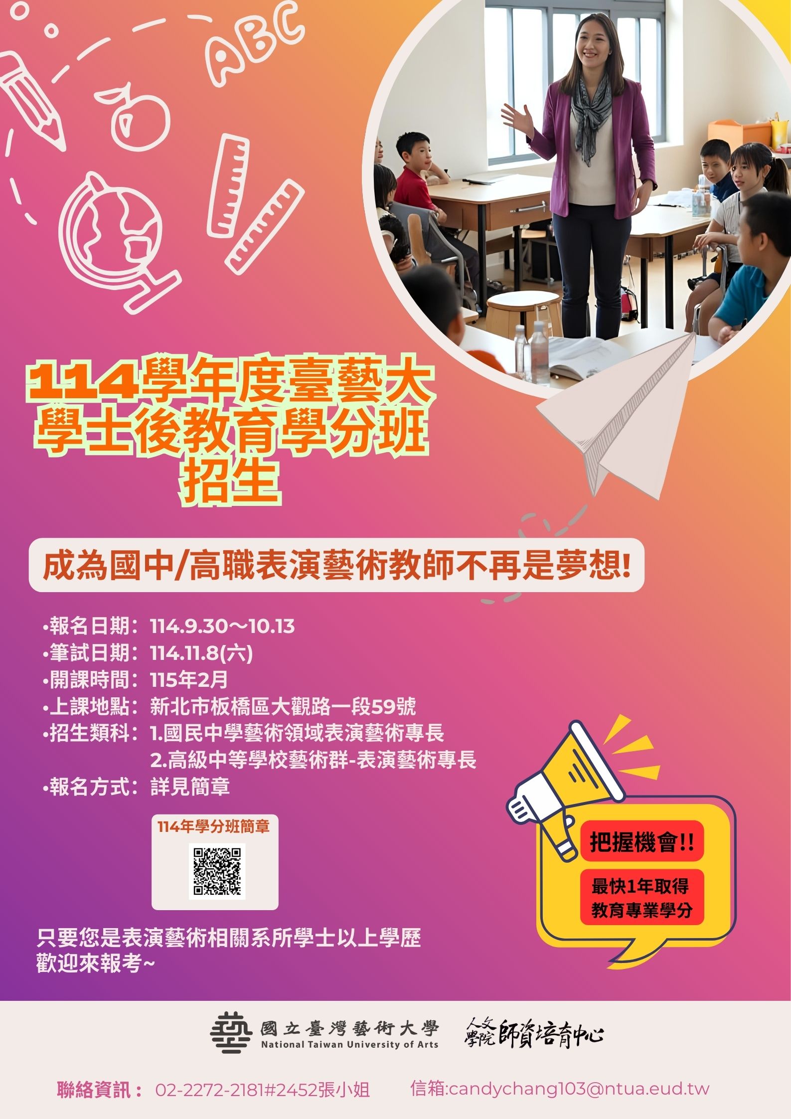 轉知國立臺灣藝術大學師資培育中心辦理「114學年度臺藝大學士後教育學分班招生」簡章及海報各乙份,請查照。