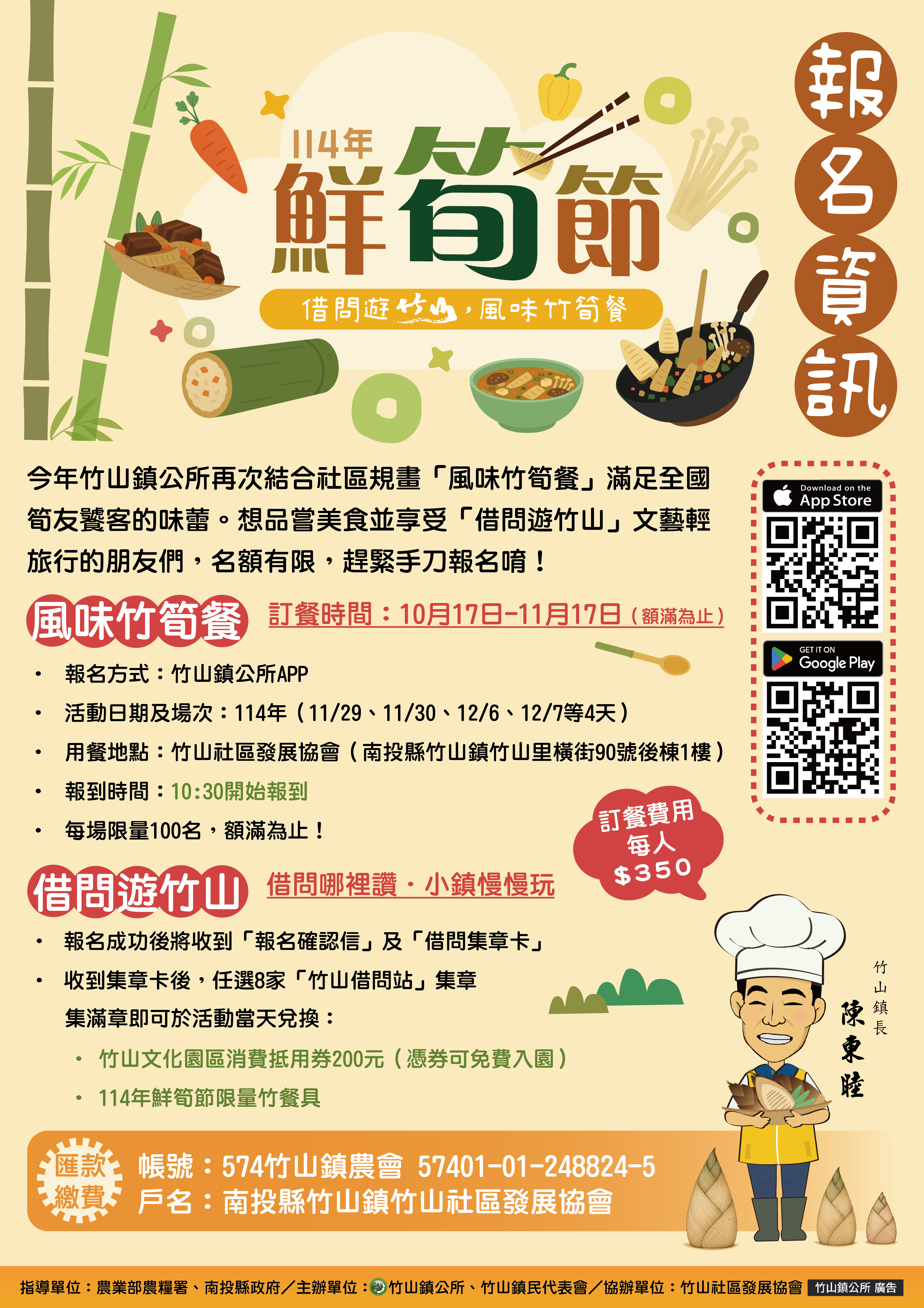 一、依據本府114年10月23日府授農秘字第1140326714號函辦理。 二、本案活動由南投縣竹山鎮公所規畫「借問遊竹山」集章輕旅行及結合社區推出「風味竹筍餐」滿足全國筍友饕客的味蕾。 三、檢附來函及報名訊息文宣。 四、本案如有疑義逕洽該縣公所承辦⼈吳小姐,電話:049-264-2175#504。