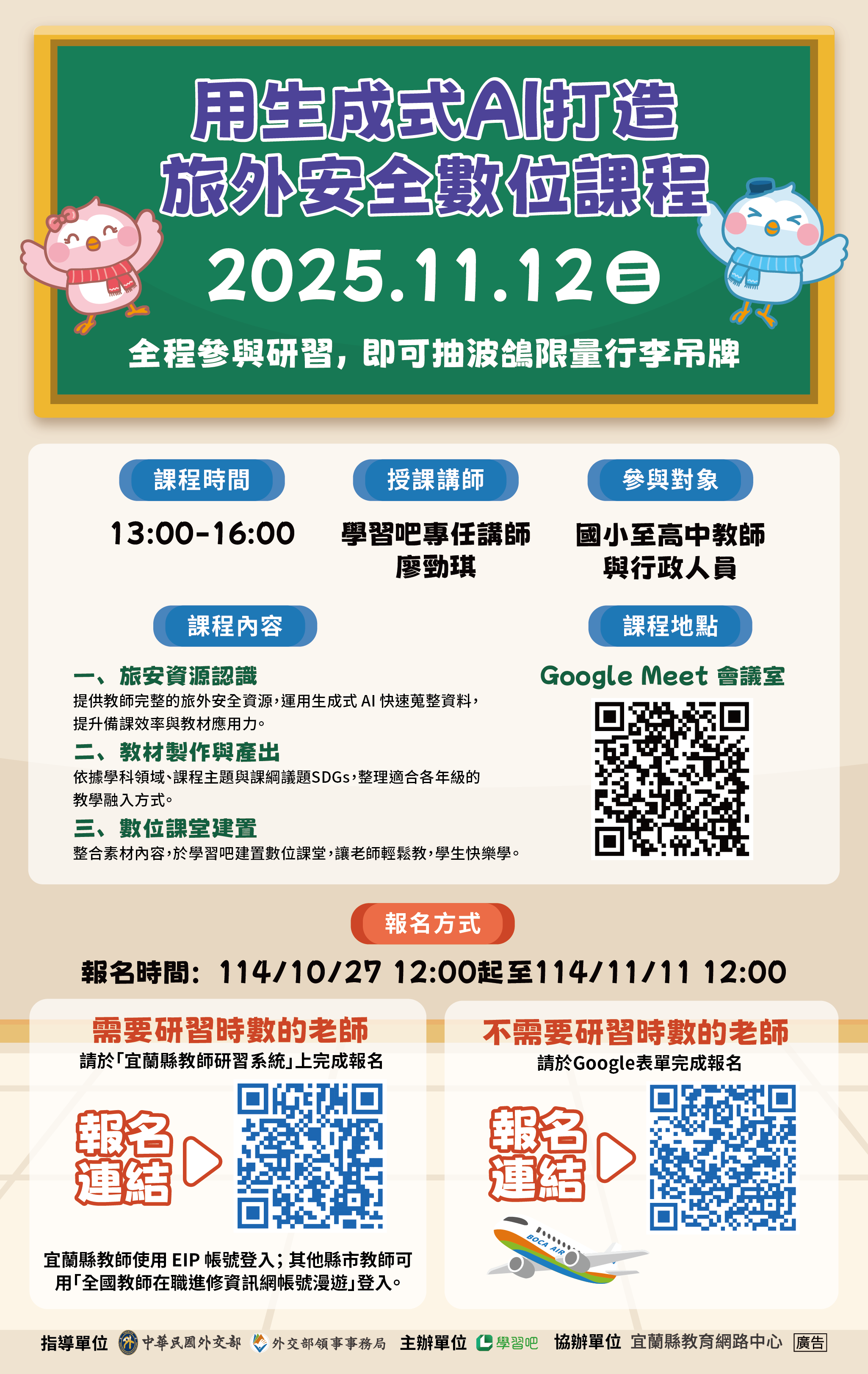 三、旨揭課程以「旅外安全」為核心,透過生成式 AI 協助教師快速整理教學資源與設計教材,提升課程創新及數位應用能力。活動資訊摘要如下(餘詳見活動簡章):