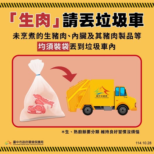 (四)來源不明的肉品,或未烹煮的生猪肉、內臟及其豬肉製品,請丟入一般垃圾。