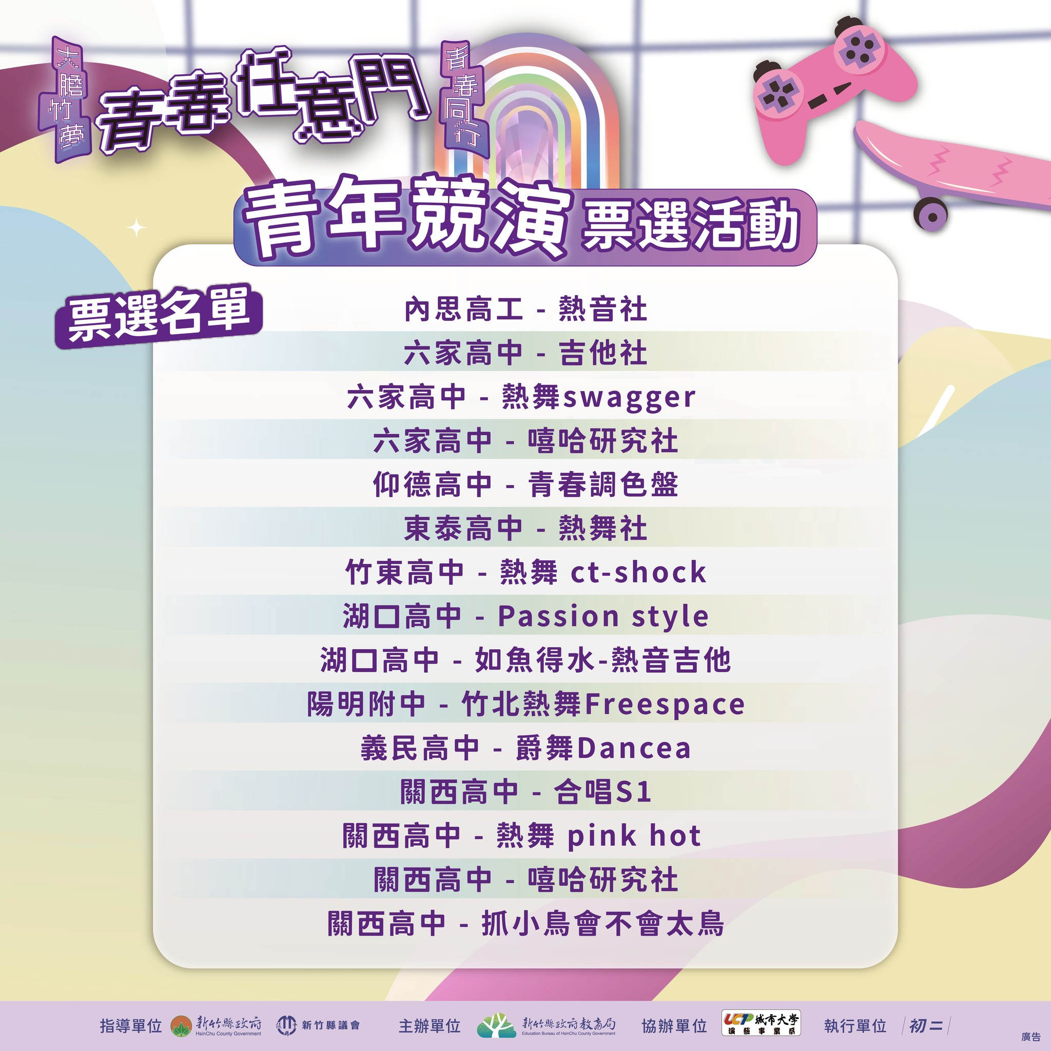 二、該局以新竹縣10所公私立高中職的青年學子為對象,舉辦以「大膽做夢,青春同行」為主題之成年禮活動,係由各校推派1組以上最能代表學校的學生表演團隊拍攝短影音並於活動前辦理青年競演線上票選活動。