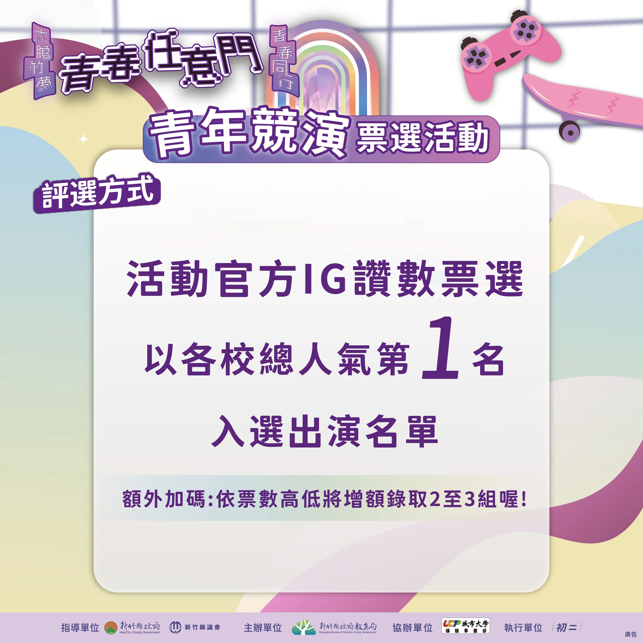 三、旨案票選活動時間:114年11月17日(星期一)上午10時起至11月26日(星期三)上午10時止,投票連結為 https://www.instagram.com/hcyouth2025。