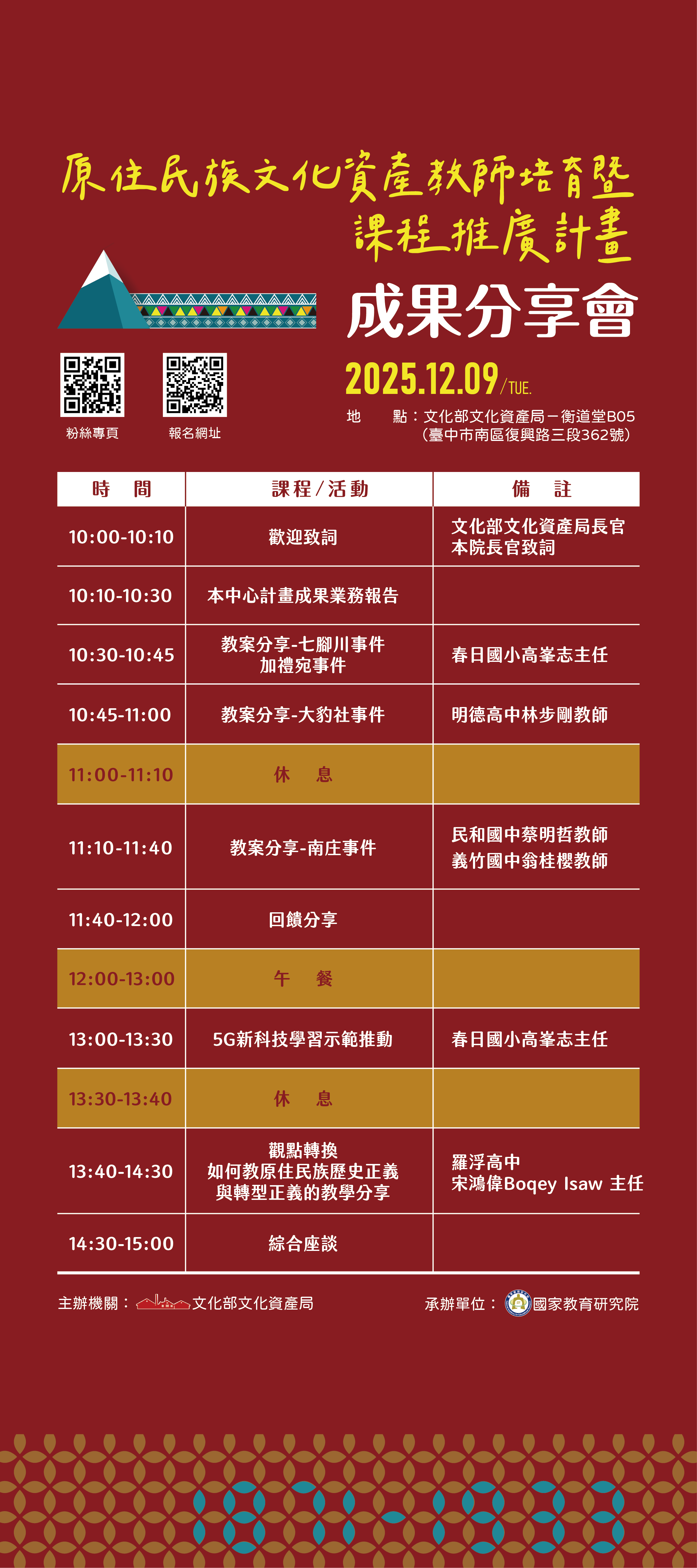 轉知國家教育研究院辦理「原住民族文化資產教師培育暨推廣課程計畫」成果分享會,如說明,請查照。