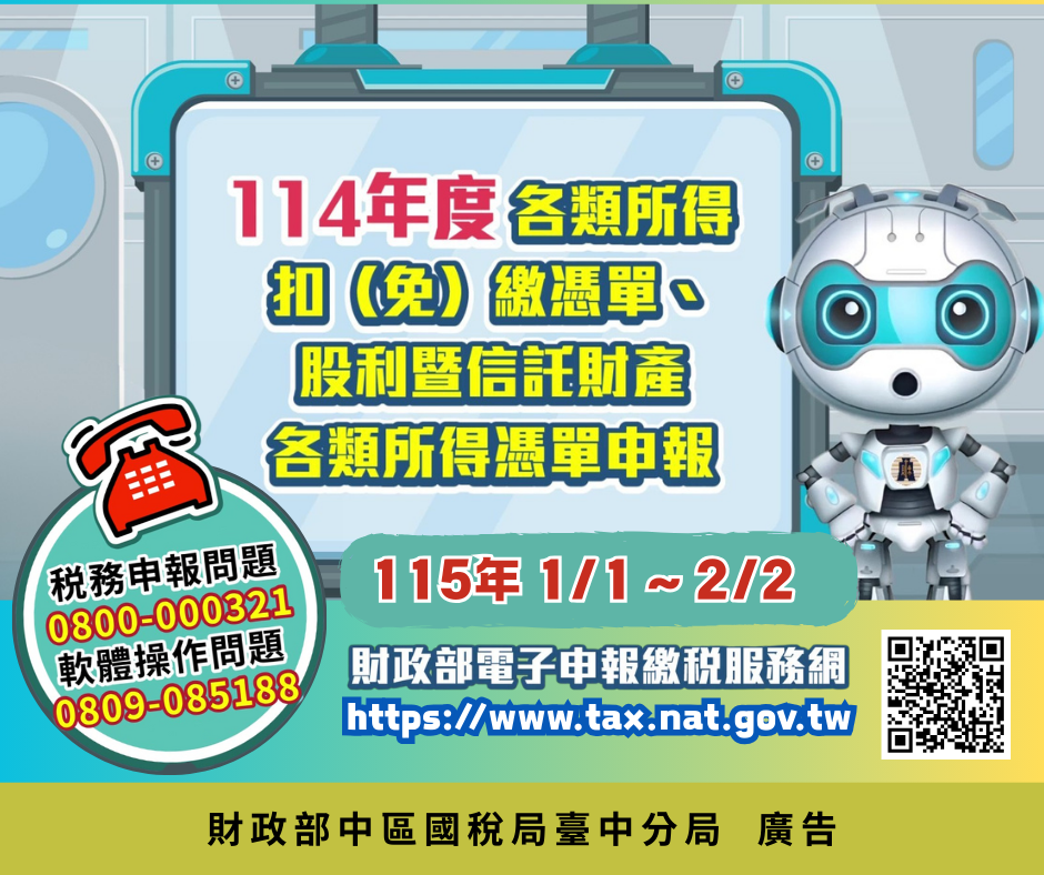 2.宣導事項「114年度各類所得扣(免)繳憑單、股利暨信託財產各類所得憑單申報期限為115年1月1日至2月2日止,採用網路申報快速又便利。國稅局臺中分局 關心您」。