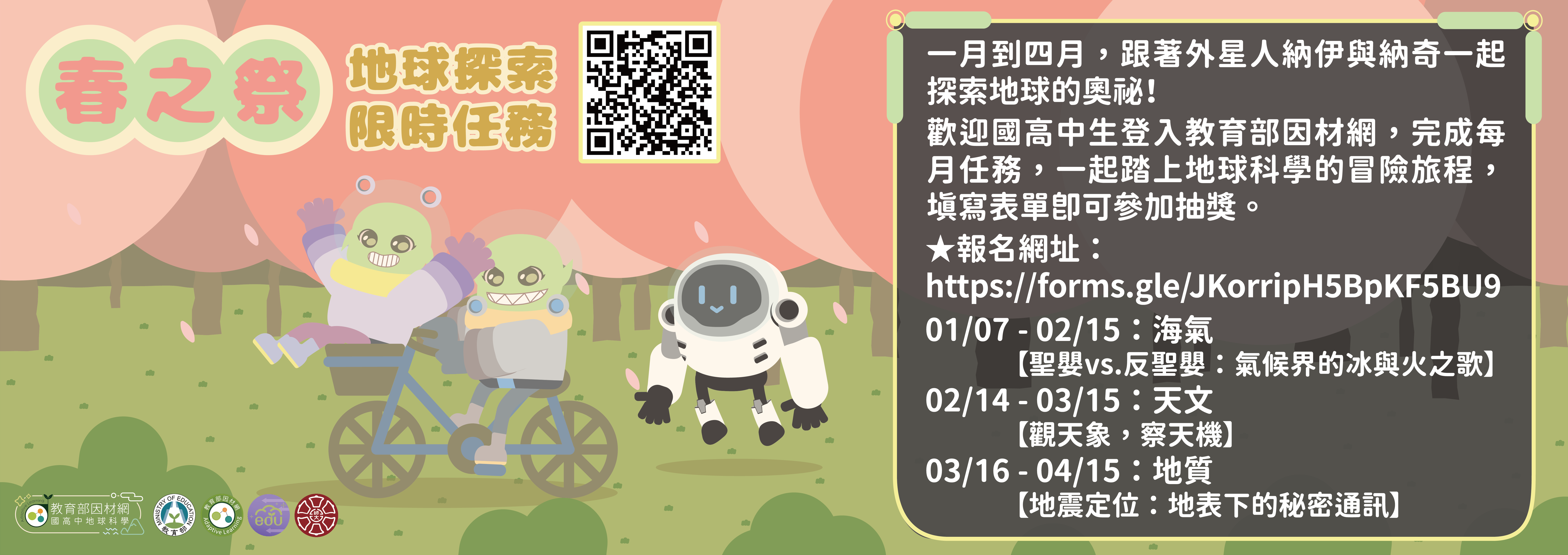 ⼀、依據國立臺灣師範大學115年1月7日師大地科字第1151000558號函辦理。 二、相關活動時間、對象、地點及報名方式,如附件。 三、倘有相關問題,請逕洽活動聯絡人廖小姐或吳先生;聯絡電話:02-77496391。