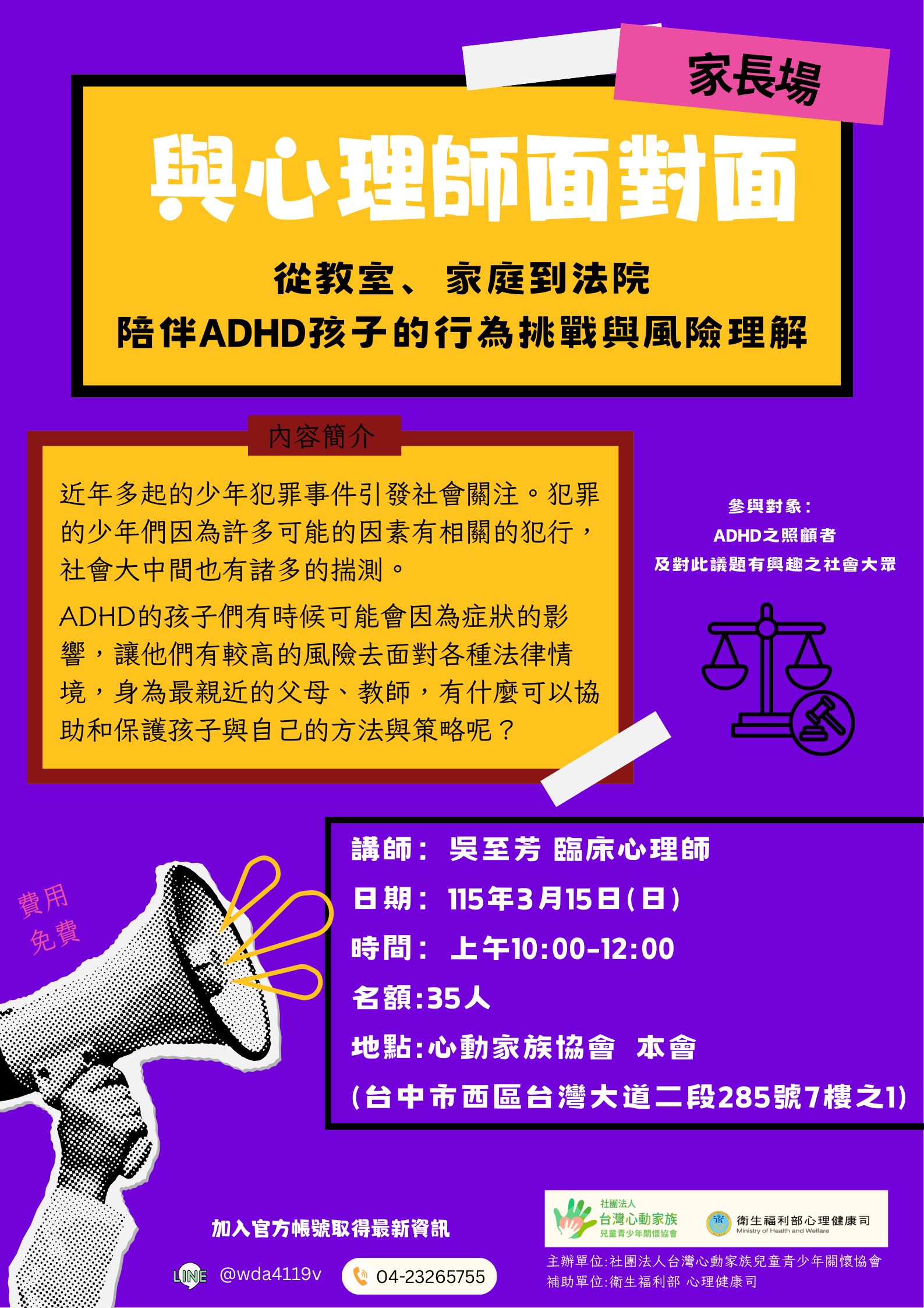 轉知社團法人台灣心動家族兒童青少年關懷協會辦理「115年03月ADHD相關主題講座及工作坊」報名資訊,請查照。