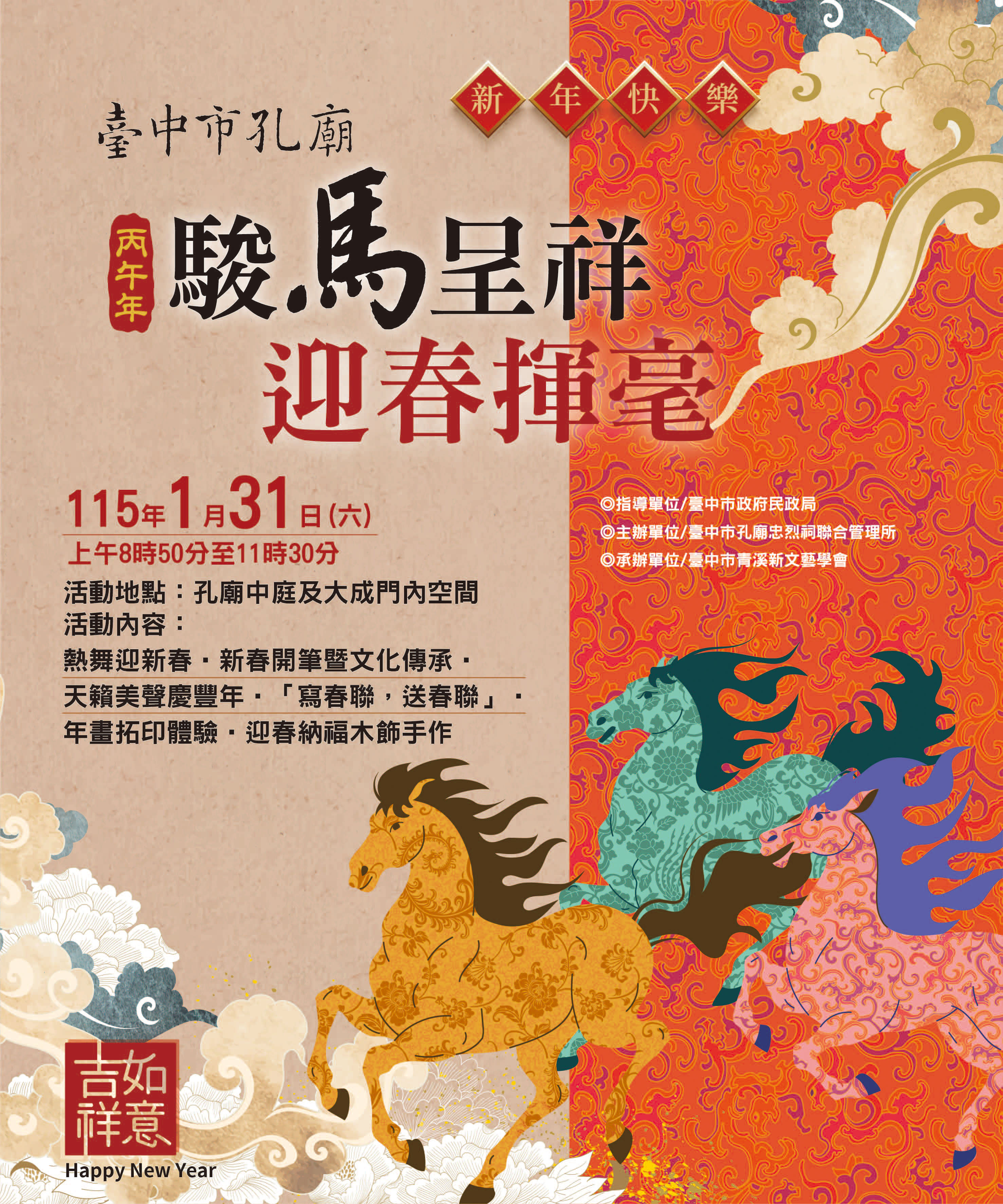 一、依據本市孔廟忠烈祠聯合管理所(以下簡稱該所)115年1月21日孔忠合字第1150000160號函辦理。 二、活動日期及地點: (一) 活動日期:115年1月31日(星期六)上午8時50分至11時30分止。 (二) 活動地點:孔廟中庭及大成門內空間。 三、檢附宣傳海報及活動程序表各1份。 四、如有其他疑問,請逕洽該所幹事曾小姐,電話(04)2233-2264#16。