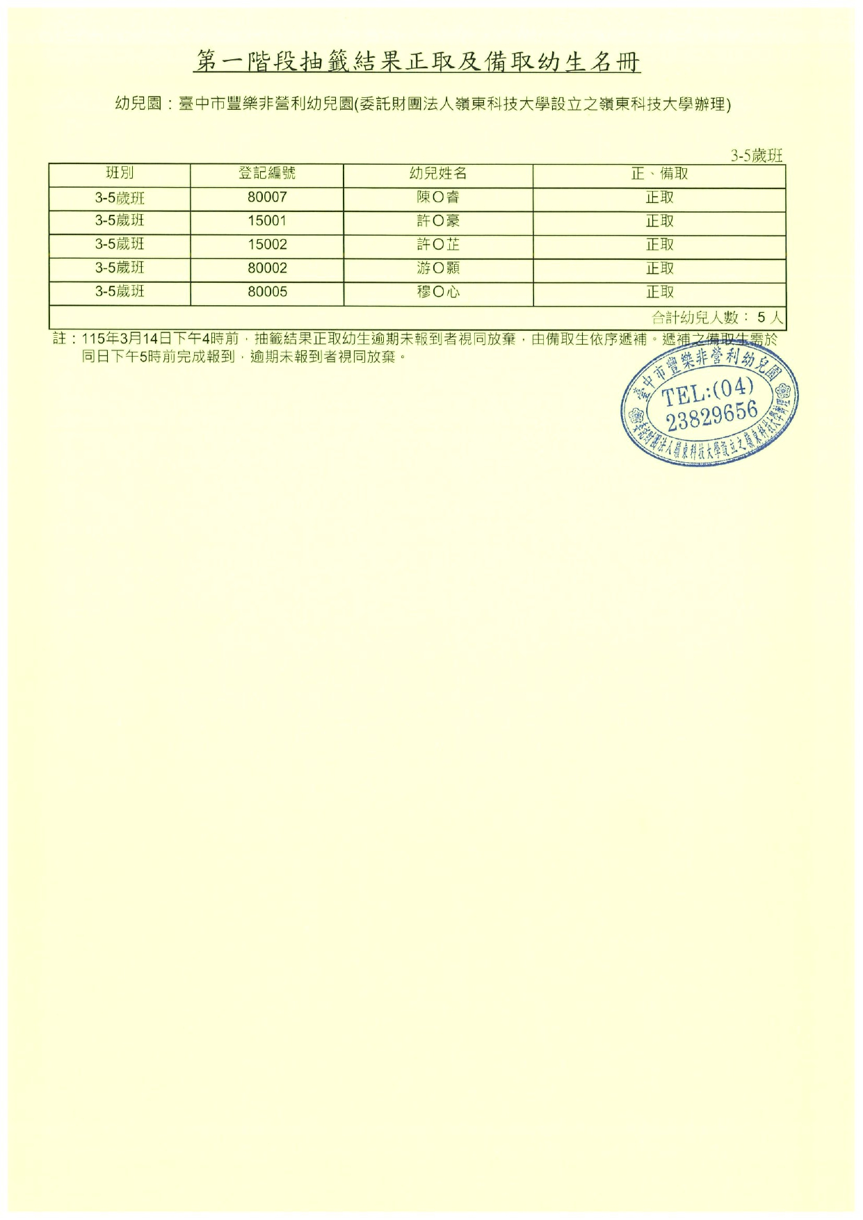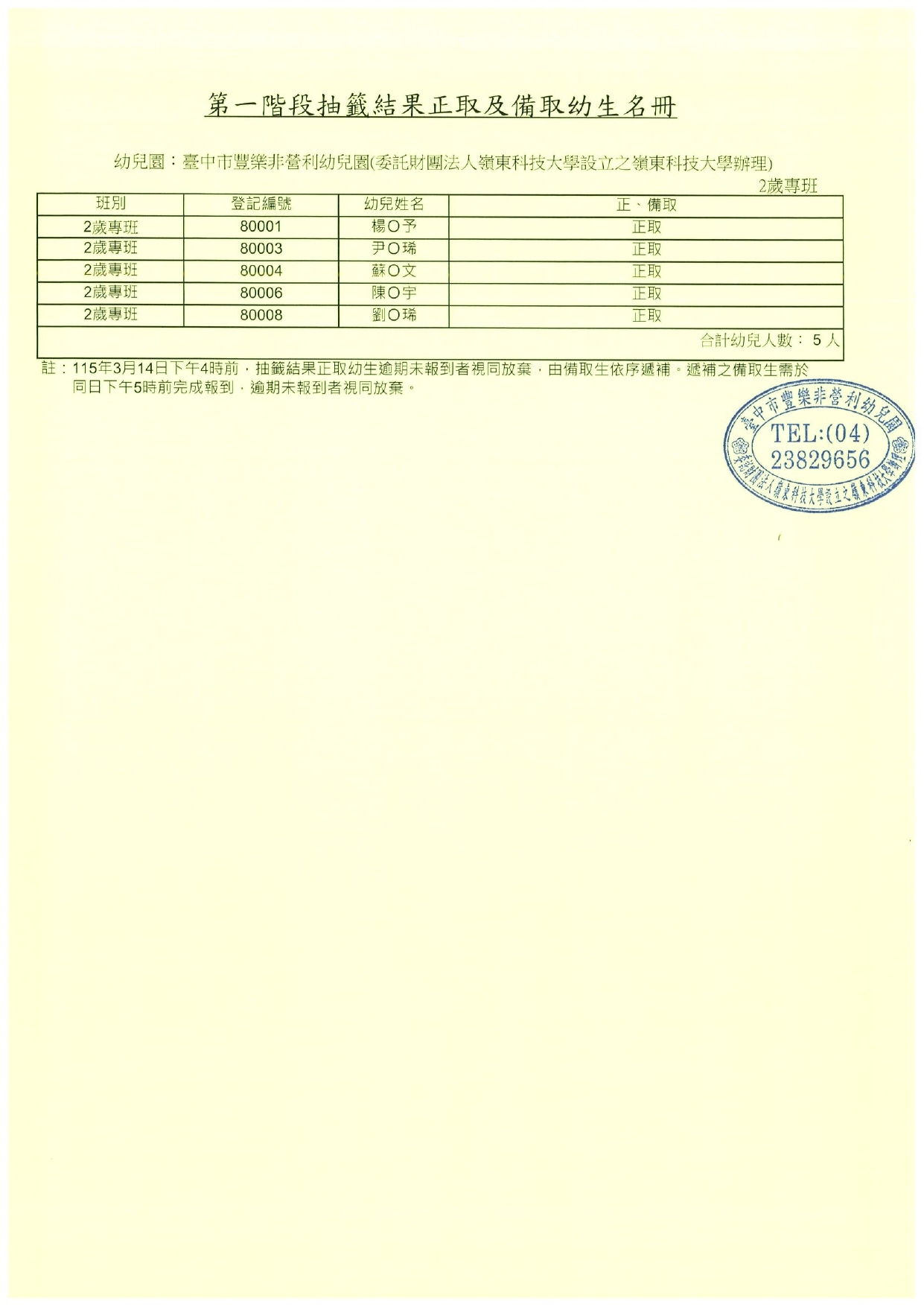 臺中市豐樂非營利幼兒園(委託財團法人嶺東科技大學設立之嶺東科技大學辦理)115學年度第一階段抽籤結果正取及備取幼生名冊