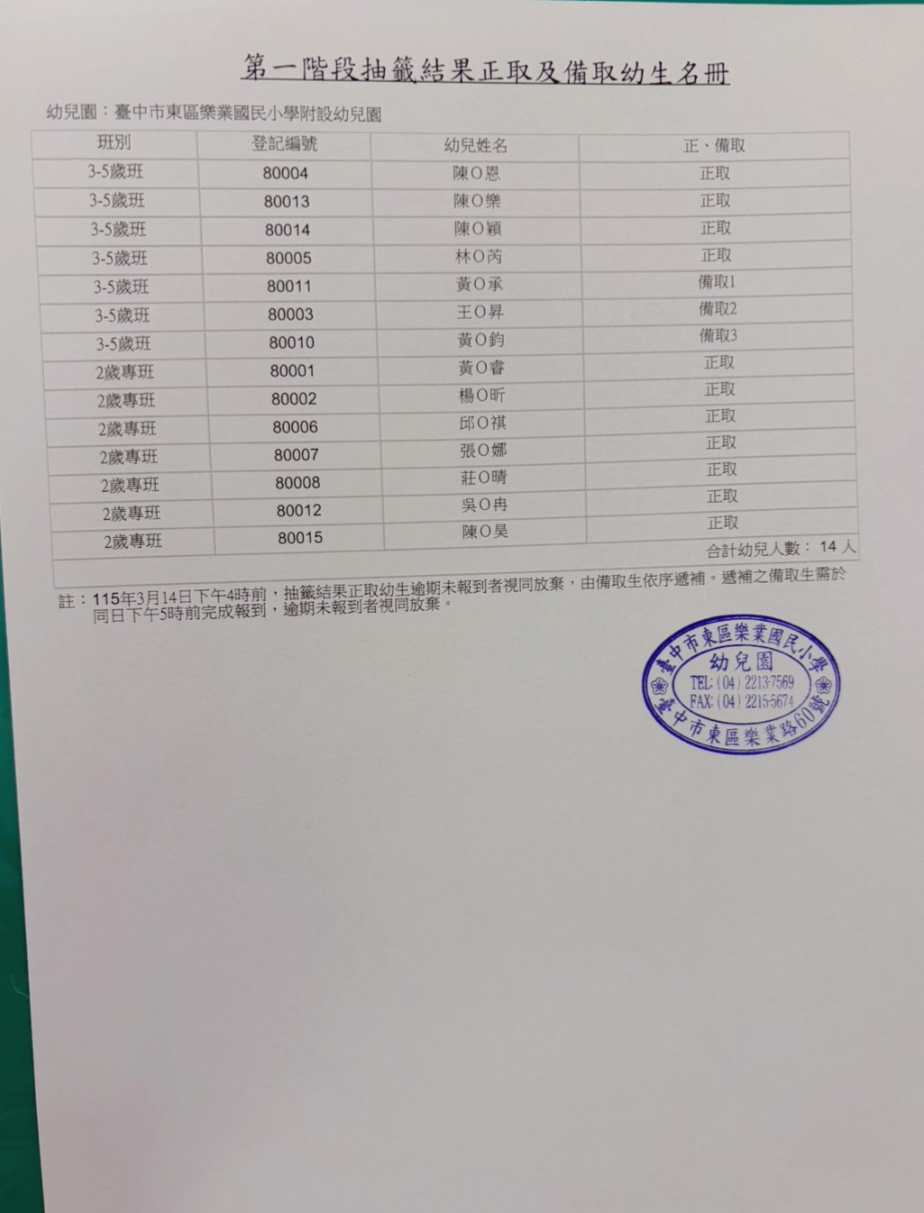 樂業國民小學附設幼兒園115學年度第一階段招生抽籤結果正取及備取幼生名冊 1. 第一階段招生抽籤結果正、備取幼生名冊如附件。 2.正取生請於下午4:00前完成報到。 3.可採線上報到或現場報到。 4.現場報到請務必攜帶登記確認單。