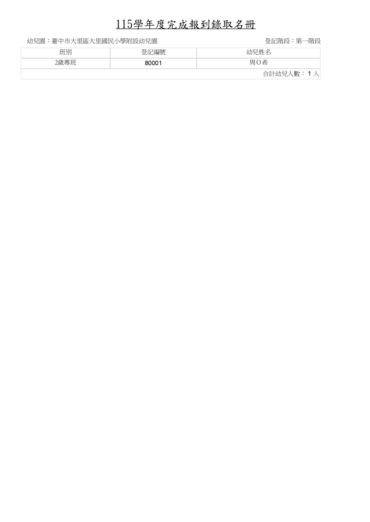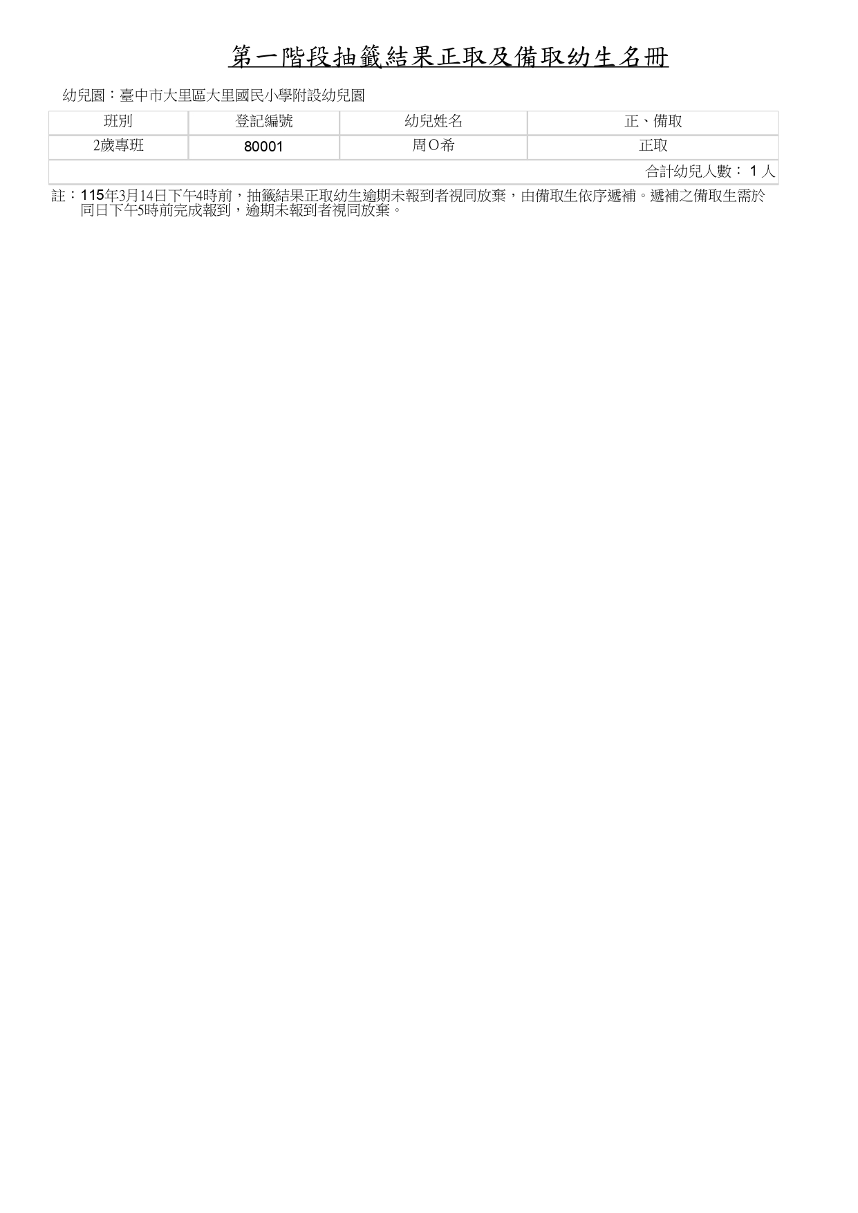 臺中市大里區大里國民小學附設幼兒園115學年度第一階段招生正備取及報到結果