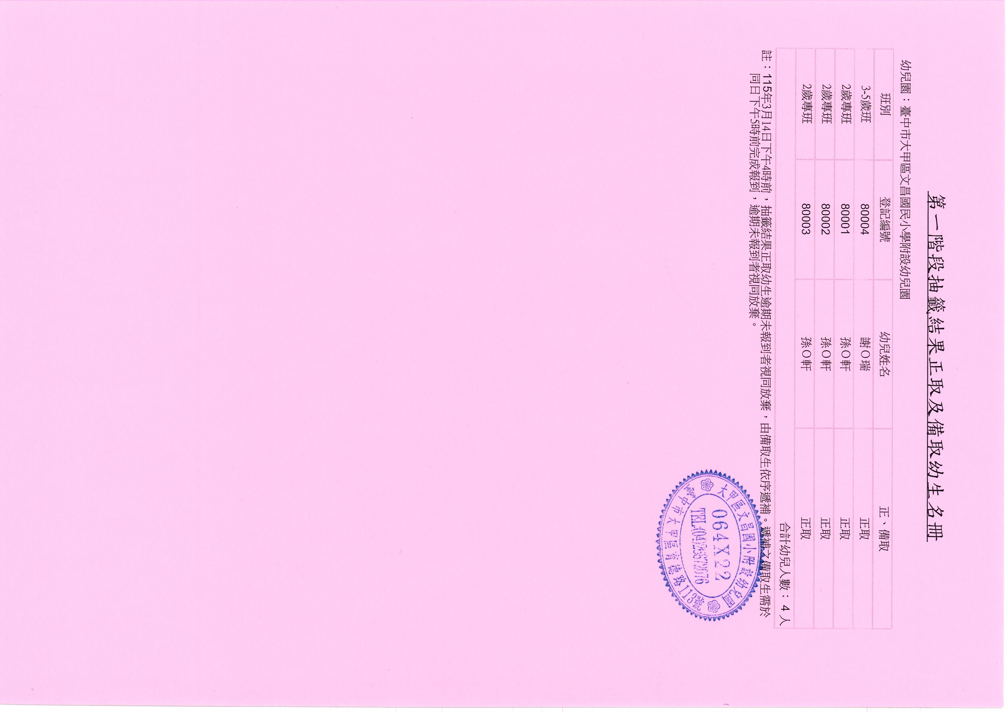 臺中市大甲區文昌國民小學附設幼兒園115學年度第一階段招生正備取及報到結果