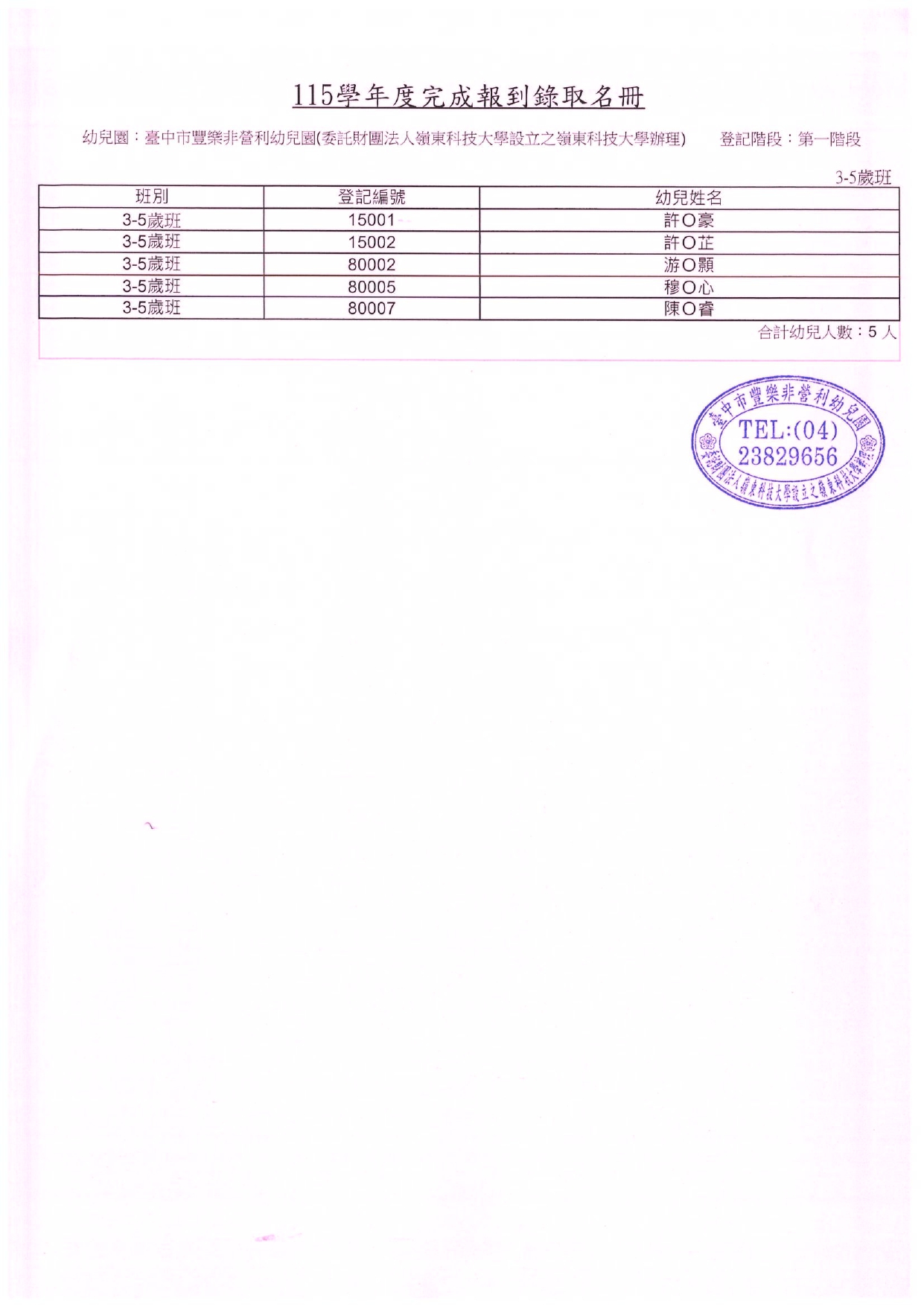 臺中市豐樂非營利幼兒園(委託財團法人嶺東科技大學設立之嶺東科技大學辦理)115學年度第一階段完成報到錄取名冊公告