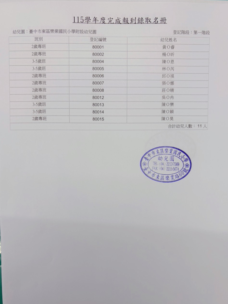 臺中市東區樂業國民小學附設幼兒園115學年度第一階段招生錄取完成報到名冊