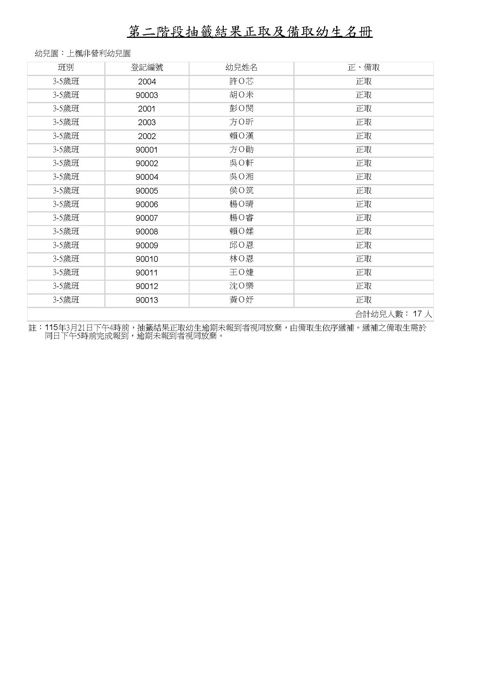 臺中市大雅區上楓非營利幼兒園115學年度第二階段抽籤正、備取生公告 第二階段抽籤結果公告如下,正取生務必於今日16:00以前完成報到手續喔!。 查詢及報到網址:https://kid-online.tc.edu.tw/