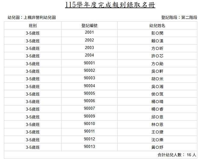 臺中市大雅區上楓非營利幼兒園115學年度第二階段報到名冊公告