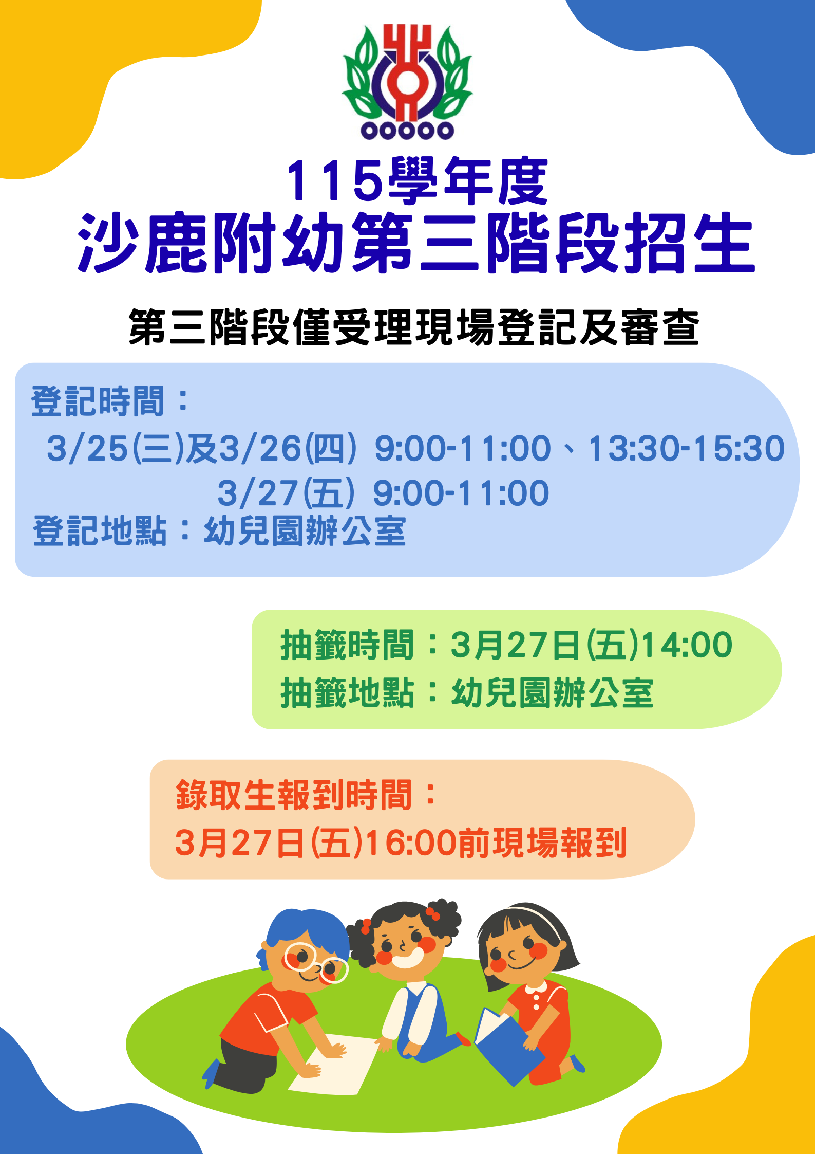 臺中市沙鹿區沙鹿國小附設幼兒園115學年度第三階段招生簡章