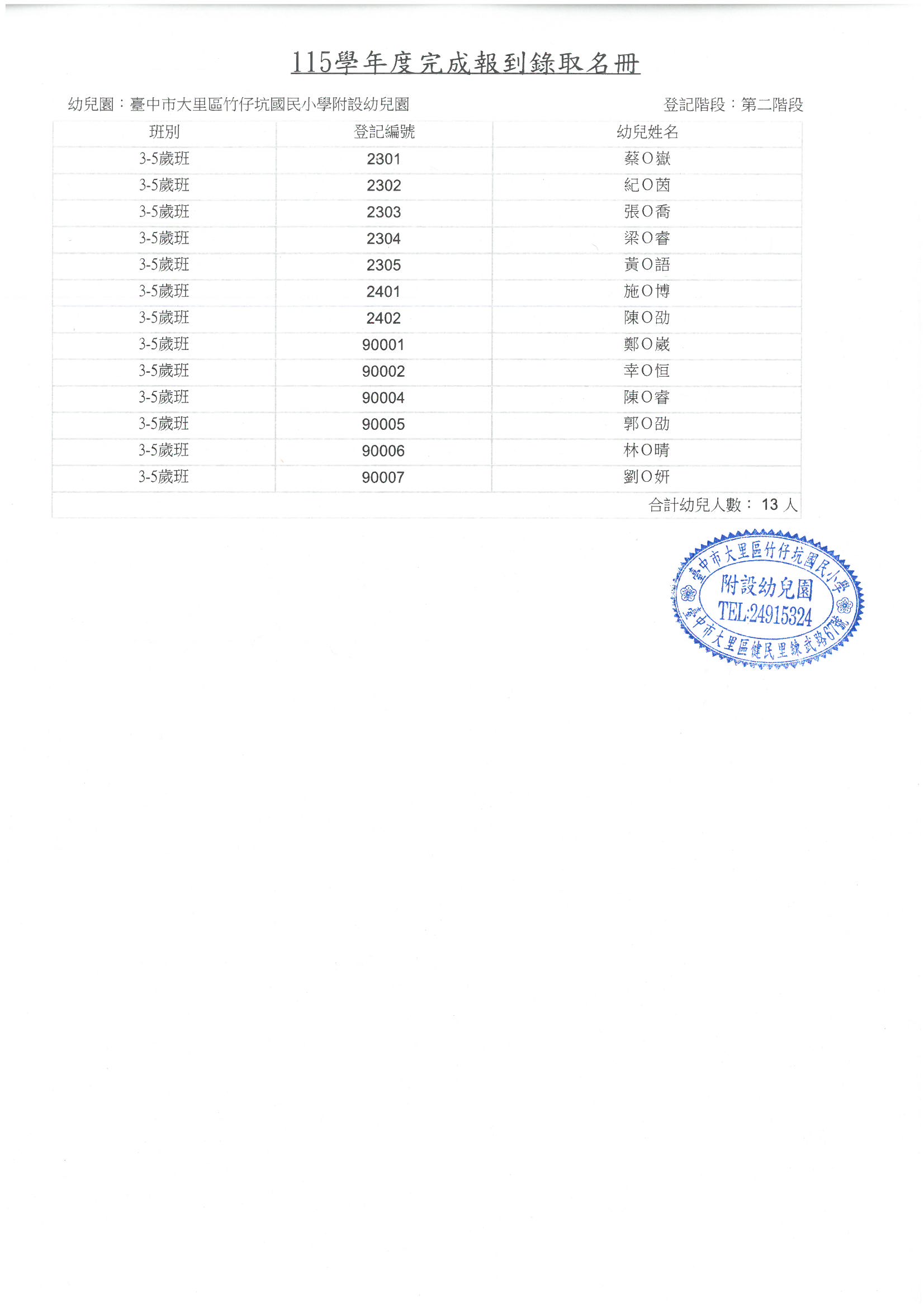 臺中市大里區竹仔坑國小附設幼兒園115學年度第二階段招生完成報到錄取名冊