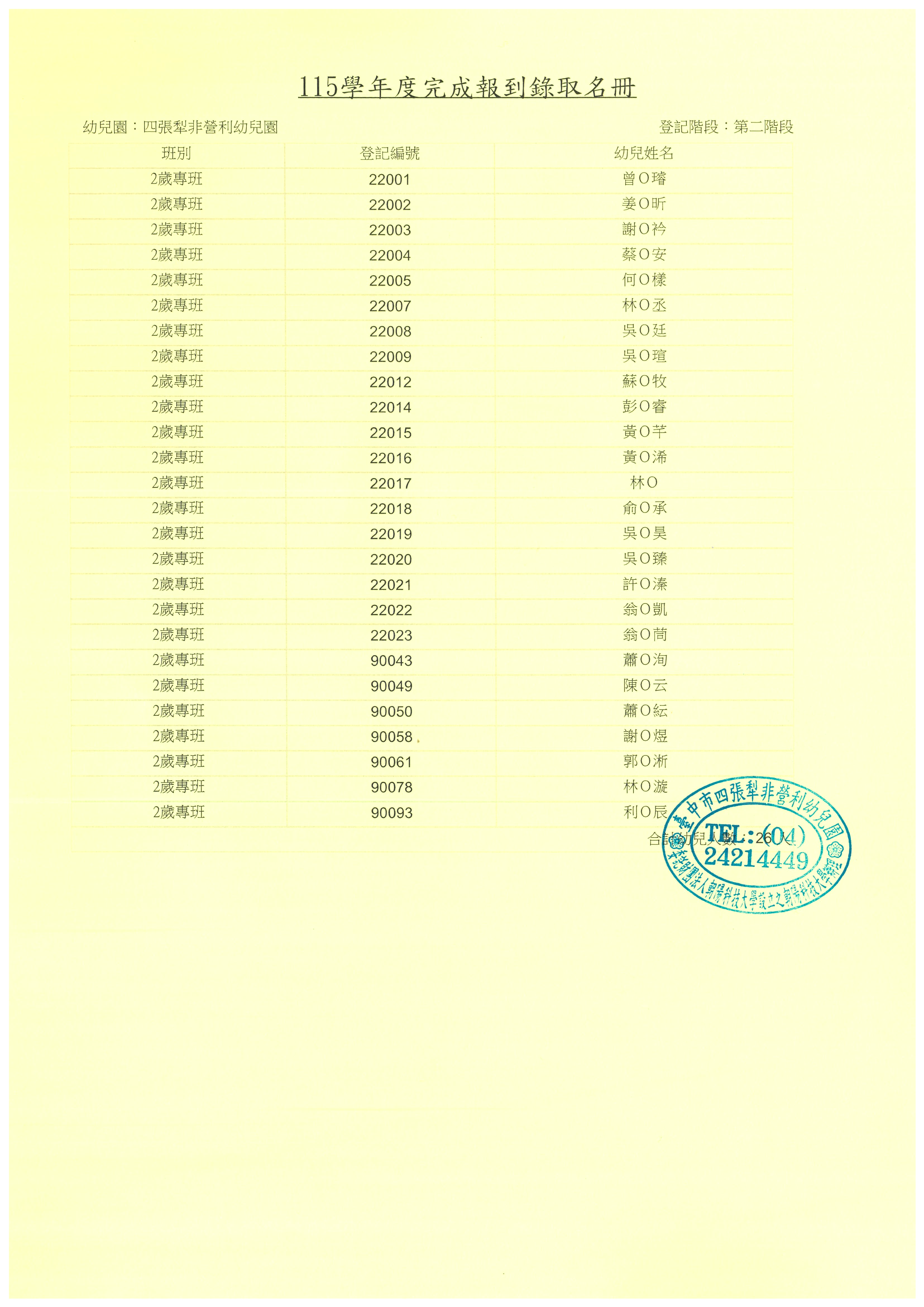 臺中市北屯區四張犁非營利幼兒園(委託財團法人朝陽科技大學設立之朝陽科技大學辦理)115學年度第二階段完成報到錄取名冊