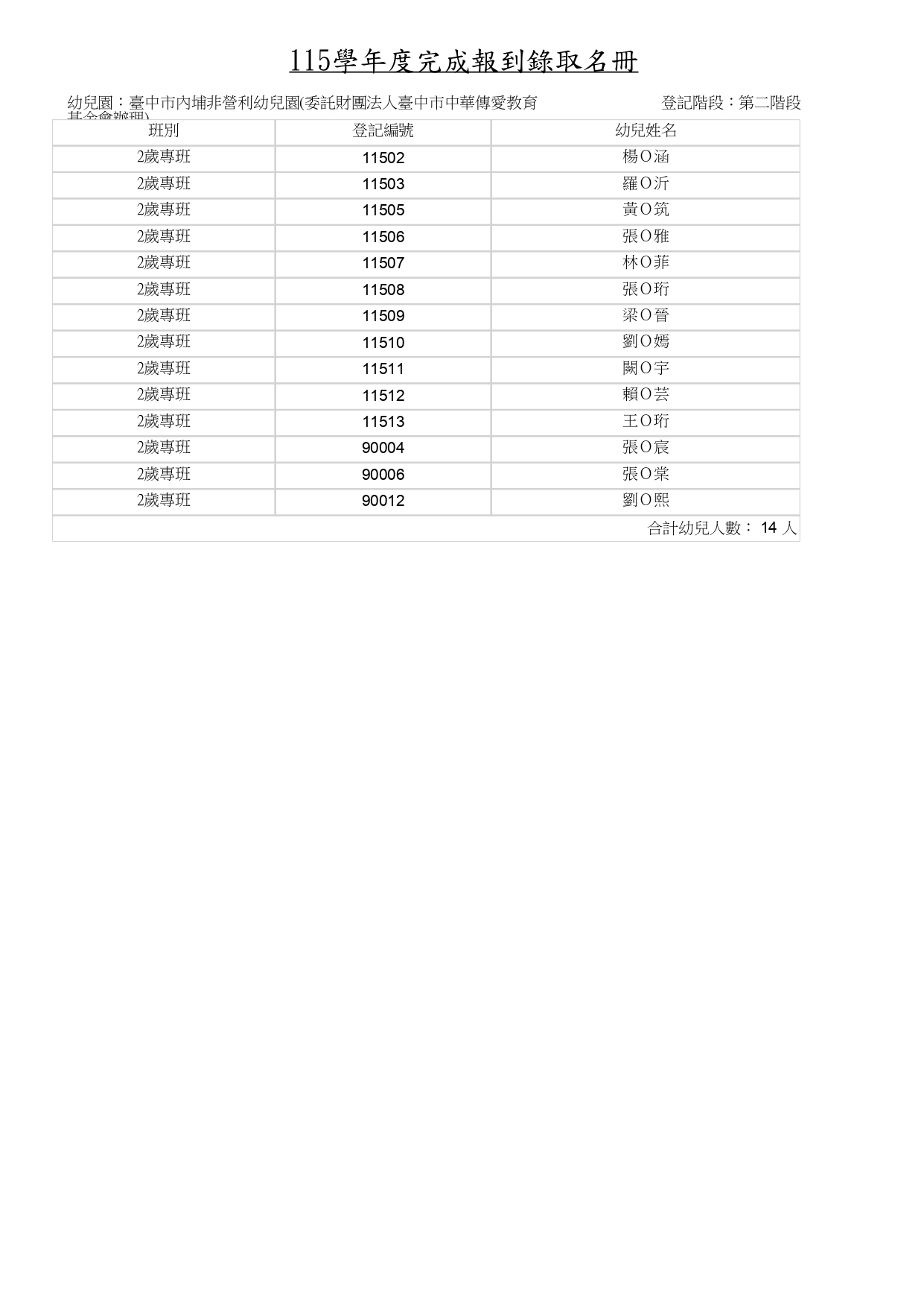臺中市內埔非營利幼兒園(委託財團法人臺中市中華傳愛教育基金會辦理)115學年度第二階段抽籤正取、備取名單;錄取報到名冊。