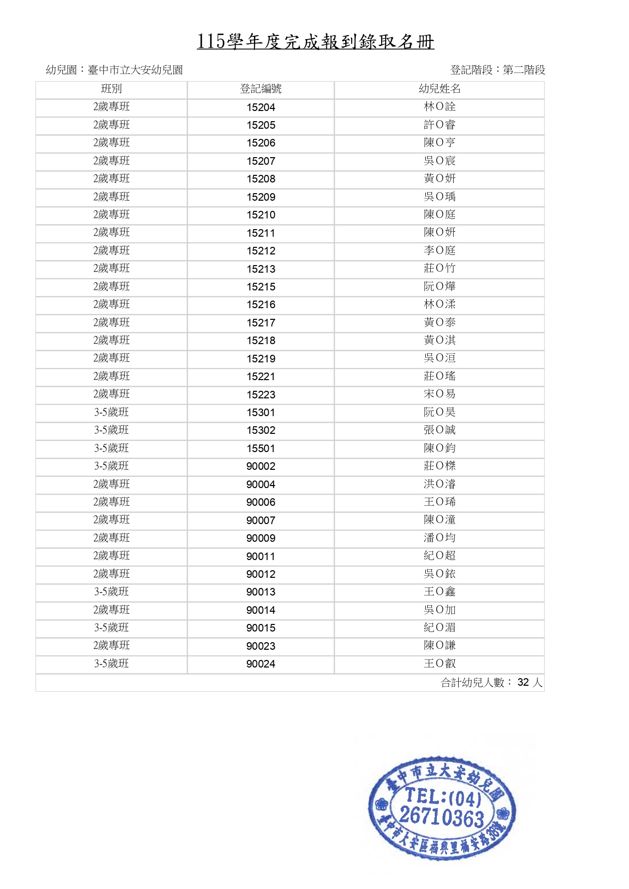臺中市立大安幼兒園115學年度第二階段招生完成報到錄取名單公告