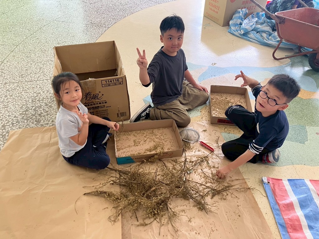 今日全校師生總動員,上課內容是如何動手篩出曬好的龍眼花花苞,校長特別提醒大家要篩乾淨,把雜質過濾掉,這樣篩出來的花苞才能做出美味的龍眼花茶,每一位孩子認真的將雜質篩出,彼此分工合作,在這堂課程中我們不只學到永續的精神亦學習到了合作學習的重要。