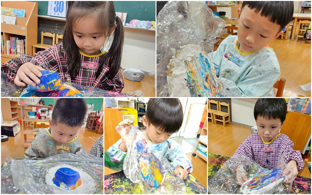 中秋節是華人三大節日之一,我們透過故事介紹了中秋節的文化習俗,了解中秋節闔家團圓以及會進行的活動:賞月、吃月餅、烤肉、吃柚子。孩子們也結合主題“紙”的課程運用廚房紙巾進行撕貼在月亮模板上,再進行顏料流動畫,觀察顏料傾斜的角度如何影響顏料的流動、體驗顏料混色及紋路在圓形紙板上展現月亮光暈的變化,看著孩子們專注、開心又滿足的笑容,可以知道他們很享受這些顏料流動產生的改變,帶給他們的驚喜,每個孩子的月亮作品都是獨一無二的呦!