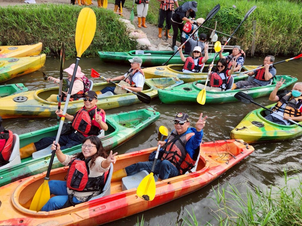 第一站來到風光明媚的埔里頭社羊角村,志工們換上雨鞋、穿上救生衣,兩人一組體驗划獨木舟的樂趣。雖然多數人初次嘗試技術上略顯笨拙,但在笑聲與歡呼聲中,大家都盡情享受難得的水上時光。接著,在解說員帶領下進入「活盆地」生態區,親身體驗會跳舞的草泥炭土壤,感受大自然奇妙的力量,也更加了解盆地的生態特色與環境保育的重要。