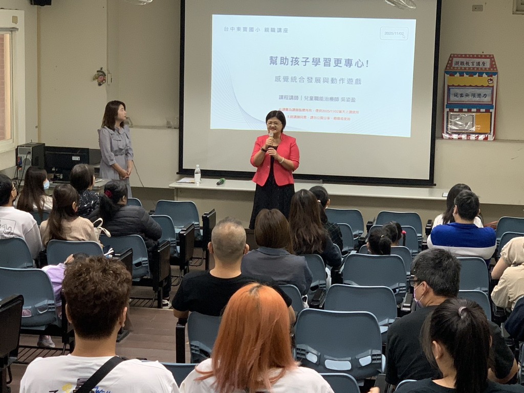 為了協助家長更了解孩子、促進家庭中更良好的親子互動,由東寶國小輔導室主辦,於昨(2)日上午特別邀請知名兒童職能治療師吳姿盈蒞校演講,主題為「玩出無限潛力」。