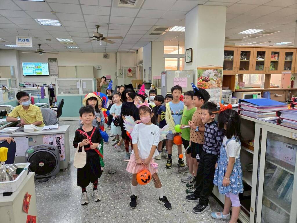 各班教室在老師與學生的巧思下,精心布置成充滿萬聖風情的主題空間:有南瓜燈、蝙蝠吊飾與繽紛糖果牆,讓校園處處散發節慶驚喜。低年級的小朋友們化身為披著斗篷的小魔法師、拿著糖果袋的小吸血鬼、笑嘻嘻的南瓜寶寶,還有穿著亮晶晶裙子的公主們,滿懷興奮地到各行政處室拜訪、表演、問好,那可愛、逗趣傳神的模樣,為校園帶來一波波歡笑與驚喜。