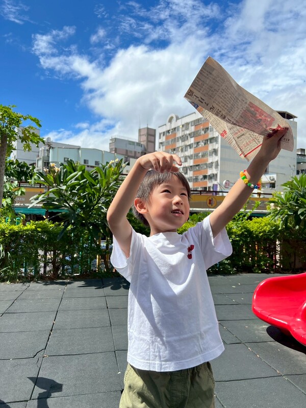 於是,在戶外時間,孩子們利用報紙,開心地玩起「報紙超人」和「紙條風箏」的遊戲,在追風、迎風的過程中,不僅體驗到風的力量,也觀察到風向變化帶來的不同感受。