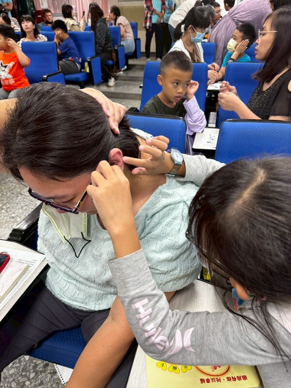 因為嘉凌老師本身是醫護人員,也在講座最後分享耳穴保健的方式,並指導大家如何貼耳穴,親子互貼耳穴時,現場歡笑聲不斷,許多孩子都是第一次摸到爸爸媽媽的耳朵,雖然過程中有點手忙腳亂,但是看著自己親手貼耳穴貼在爸媽耳朵上時,許多孩子都忍不住發出我好厲害的聲音,讓講座現場的熱絡氣氛又升起了一波小高潮。